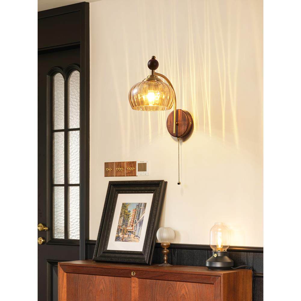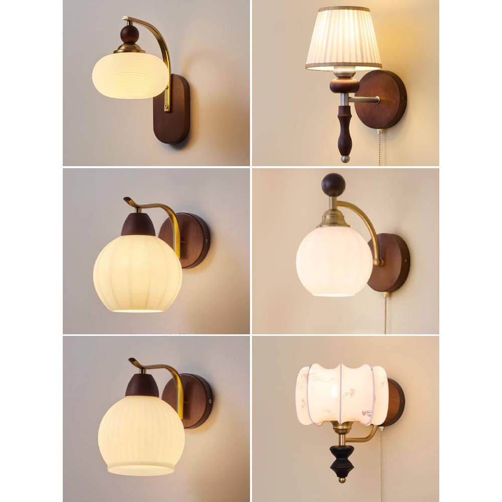 📚 美式复古床头灯中古风实木感卧室壁灯拉绳开关书房过道玄关灯