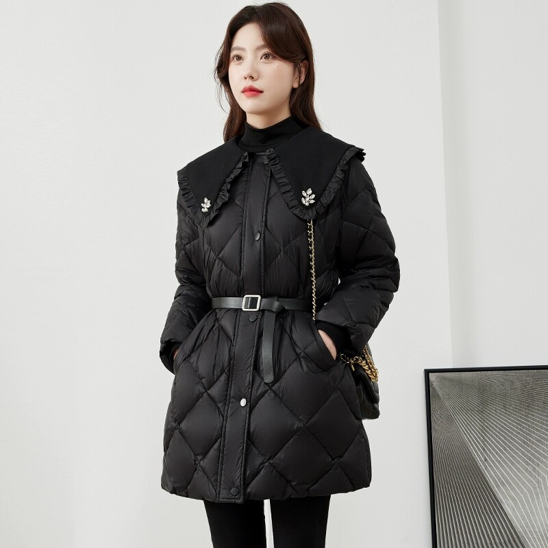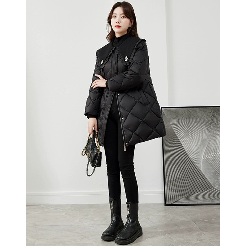 📚 娃娃领黑色羽绒服女中长款2025秋冬新款小个子高级感轻薄保暖外套