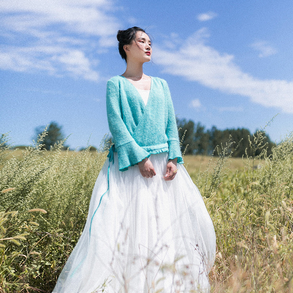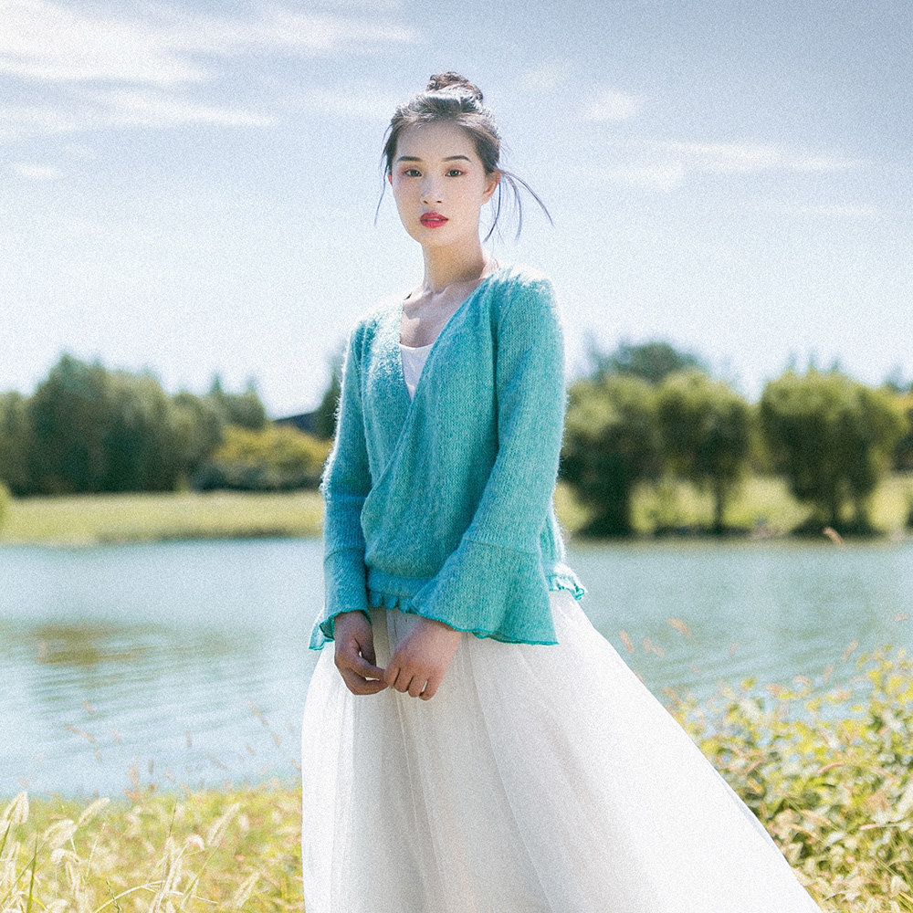 📚 【7折出清】2025新款文艺复古改良汉服针织长袖短款v领系带外套女