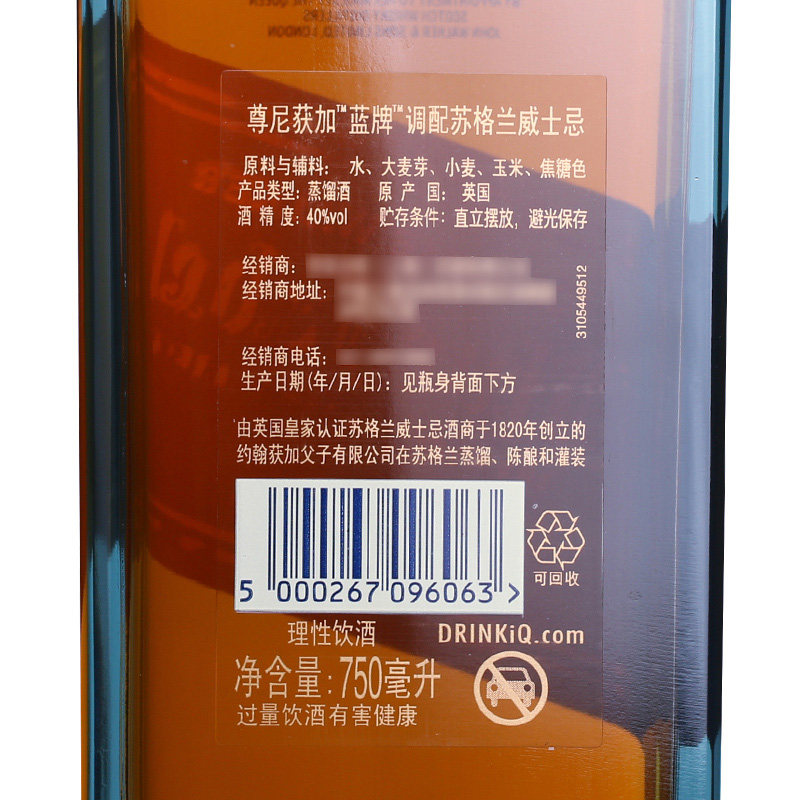 📚 Johnnie Walker尊尼获加蓝牌调配苏格兰威士忌750ml英国进口洋酒