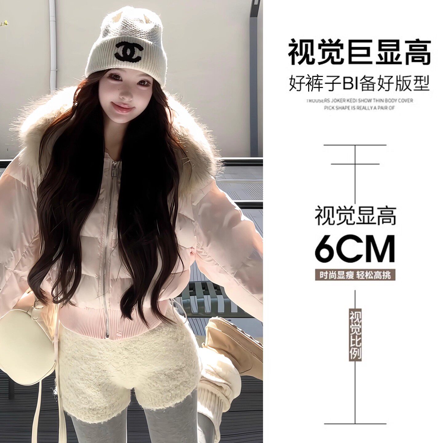 📚 2025新款显瘦高腰慵懒白色羊羔绒短裤女秋冬a字打底保暖毛绒靴裤