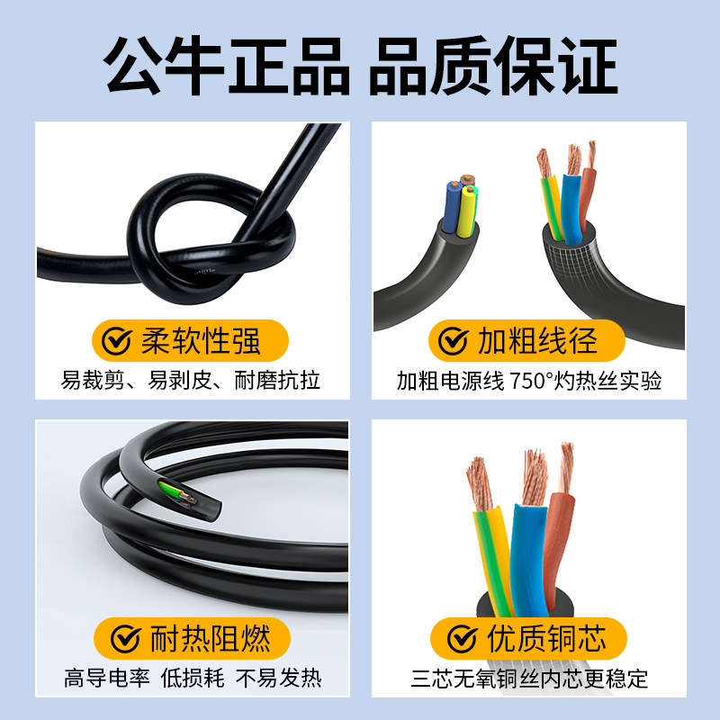 📚 公牛纯铜家用插座电线3芯10a超薄扁平电源线带插头插排线缆裸线