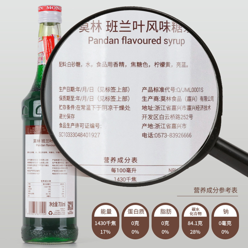 📚 送配方 MONIN莫林班兰叶风味糖浆700ml 斑斓果汁/酱调咖啡鸡尾酒
