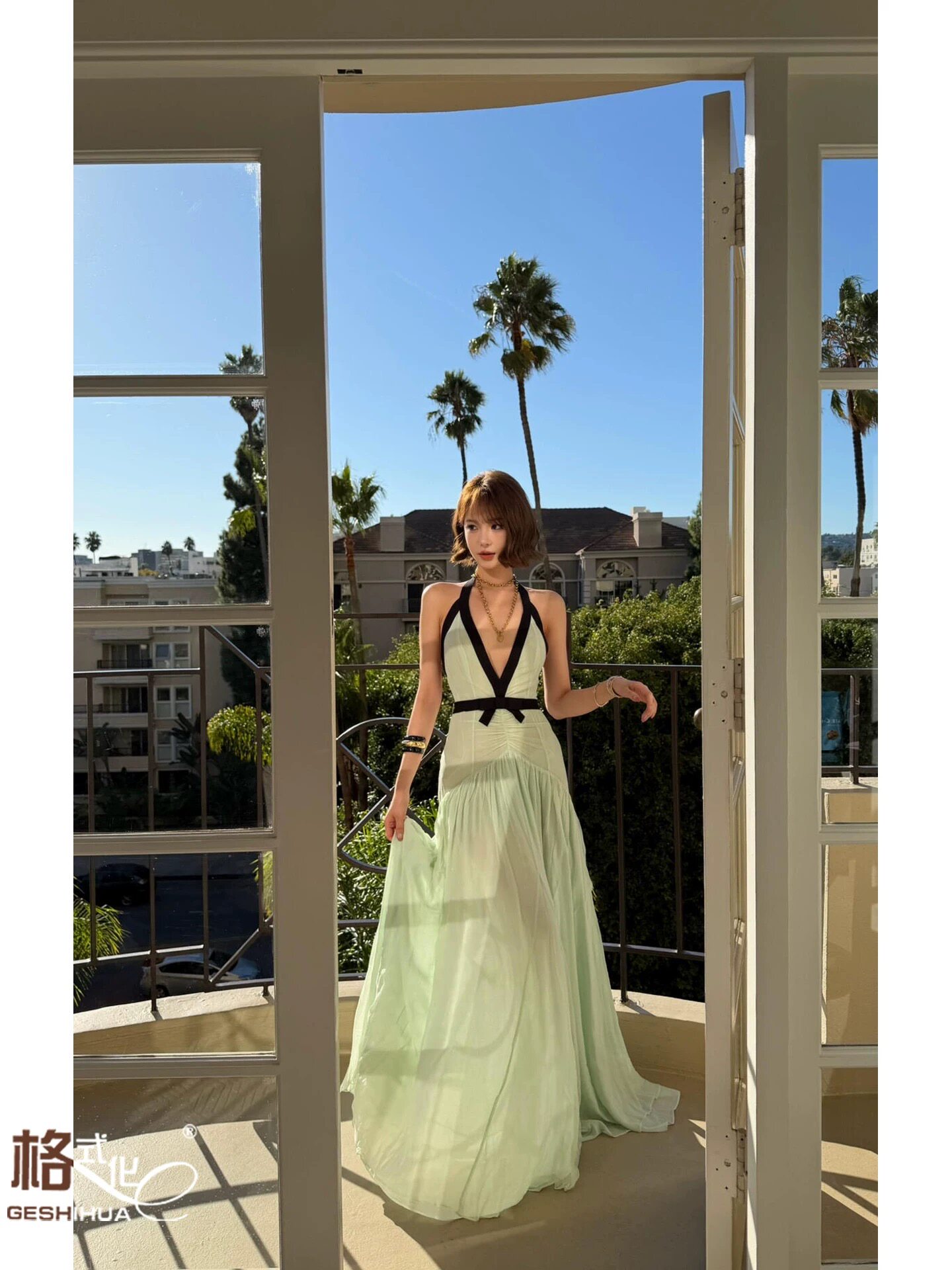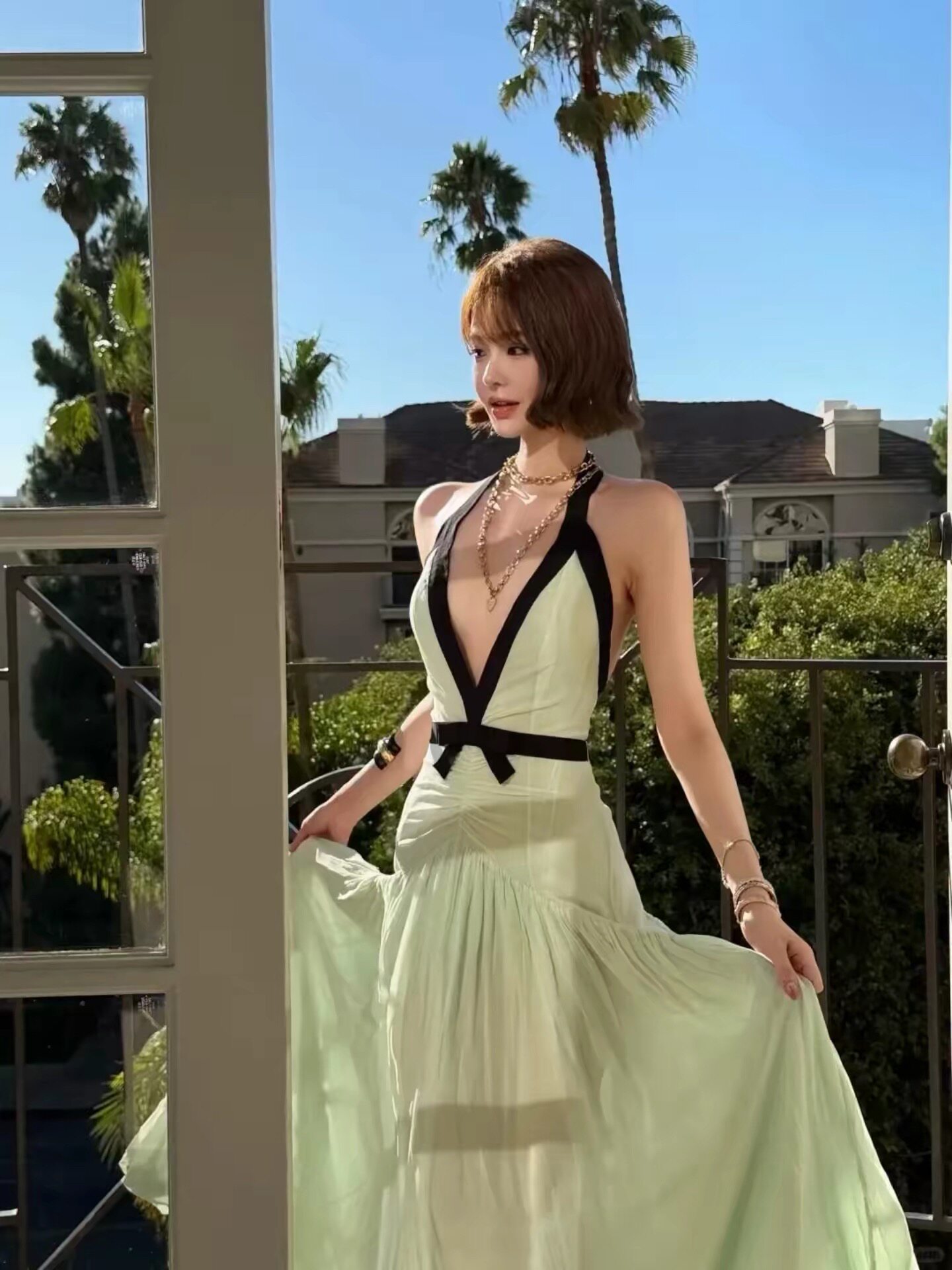 📚 欧美纯欲风声v挂脖裙大露背蝴蝶结褶皱party晚宴会生日礼服度假裙