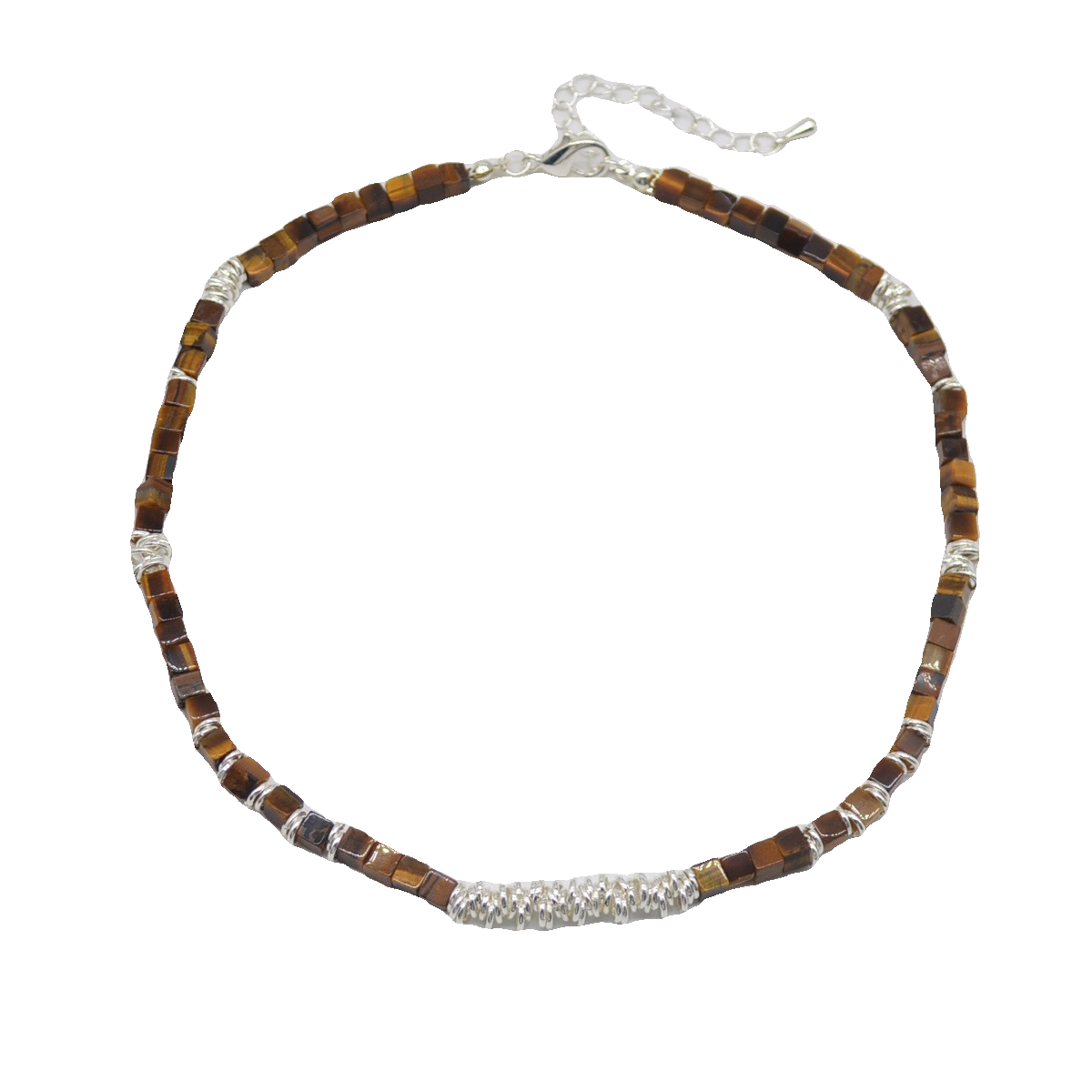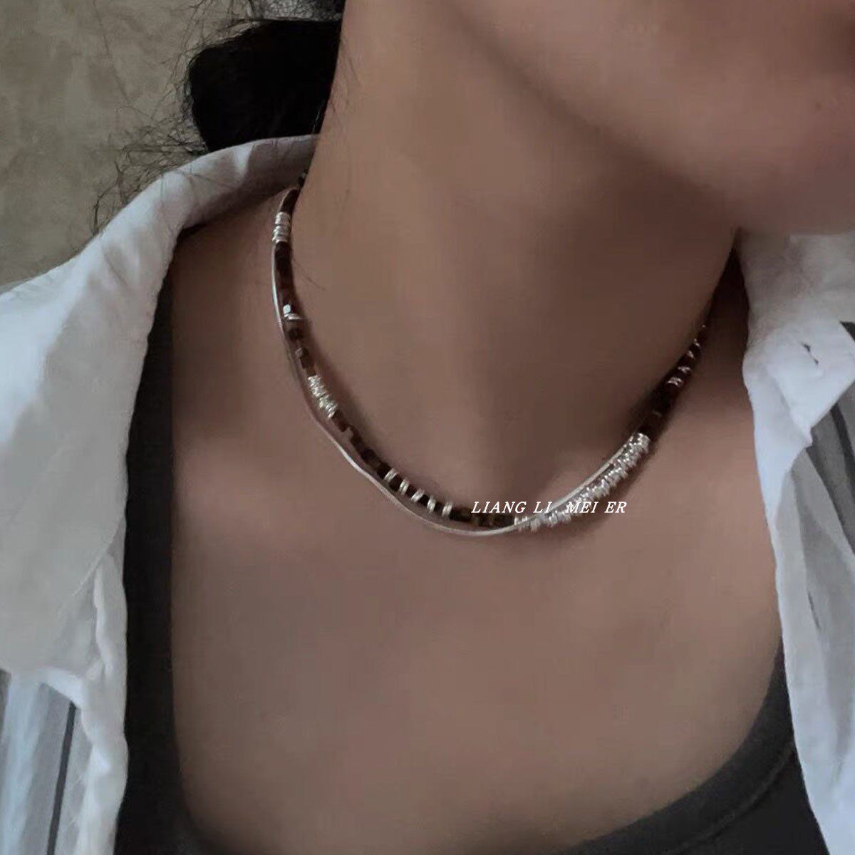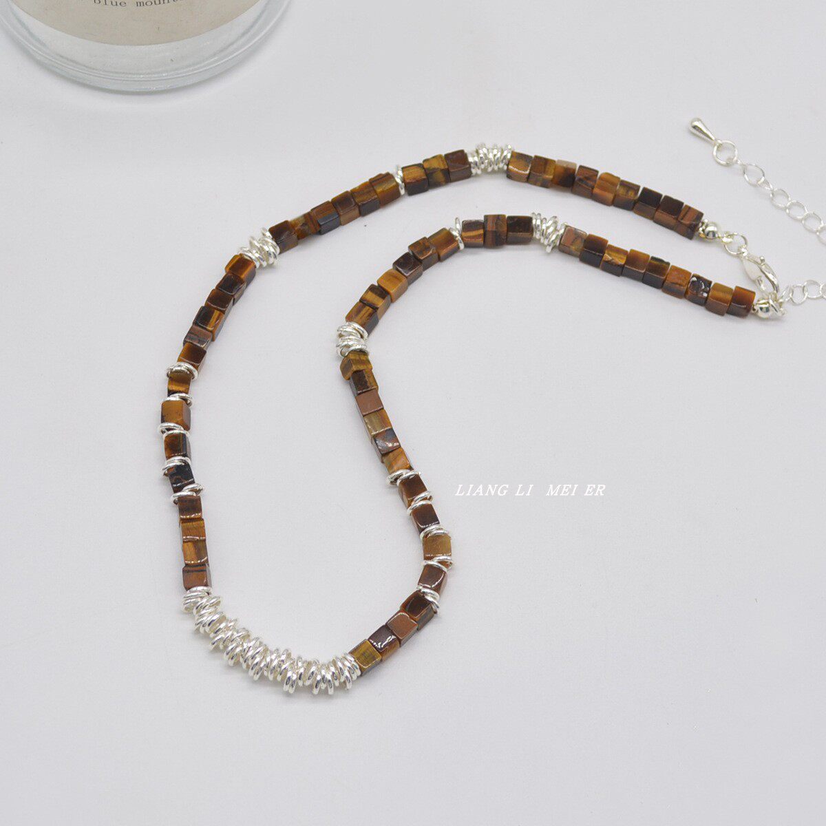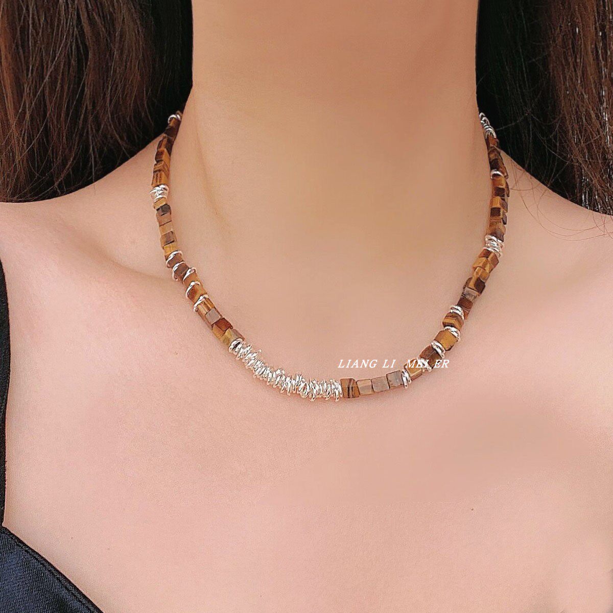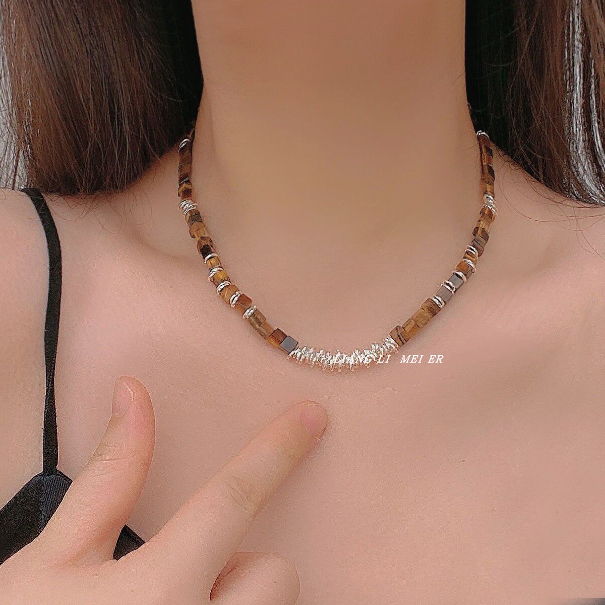 📚 复古小众虎眼石竹节项链碎银拼接棕色串珠几何时尚妹锁骨链颈链