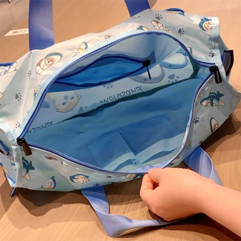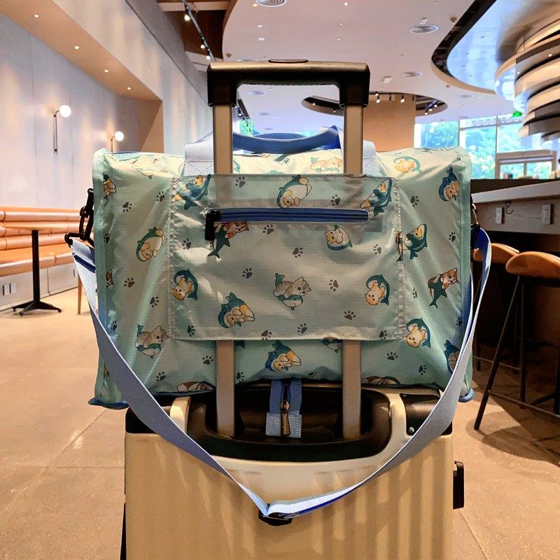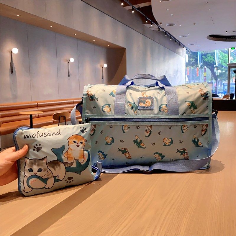 📚 日系卡通沙鱼猫印花可爱旅行袋折叠收纳大容量短途衣物整理行李袋