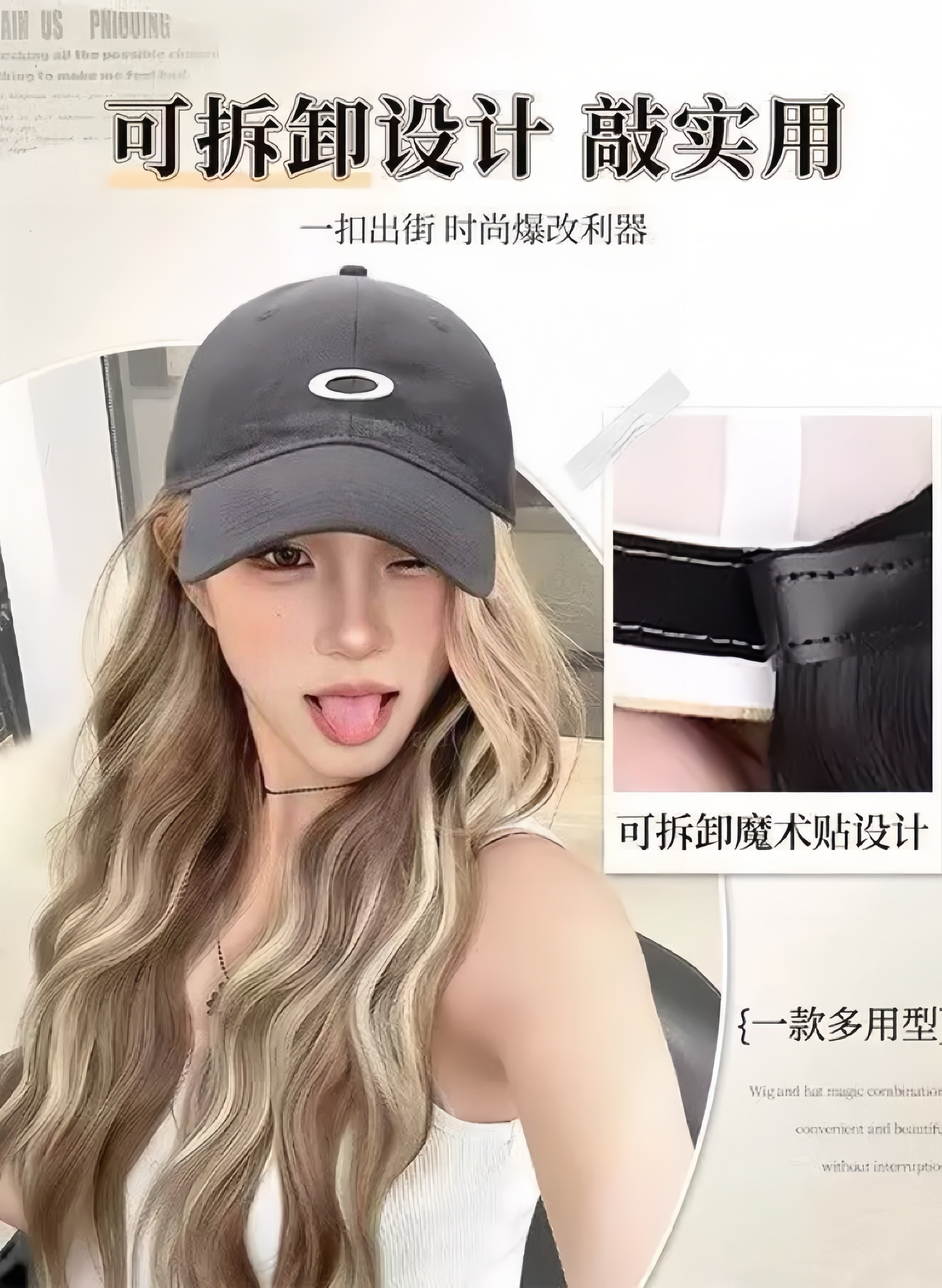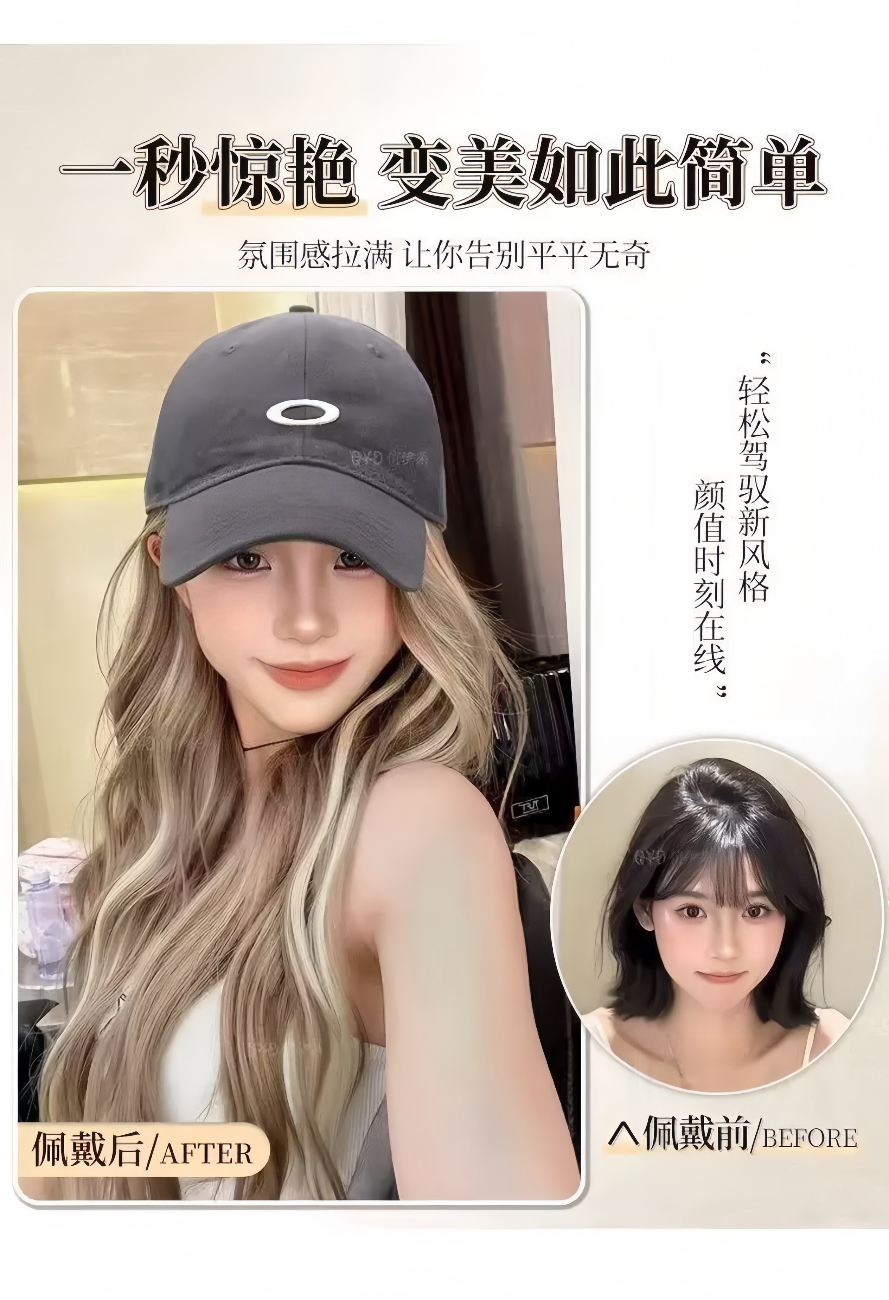 📚 假发帽子一体女仿真发白金色时尚美式亚裔辣妹风长卷发挑染棒球帽