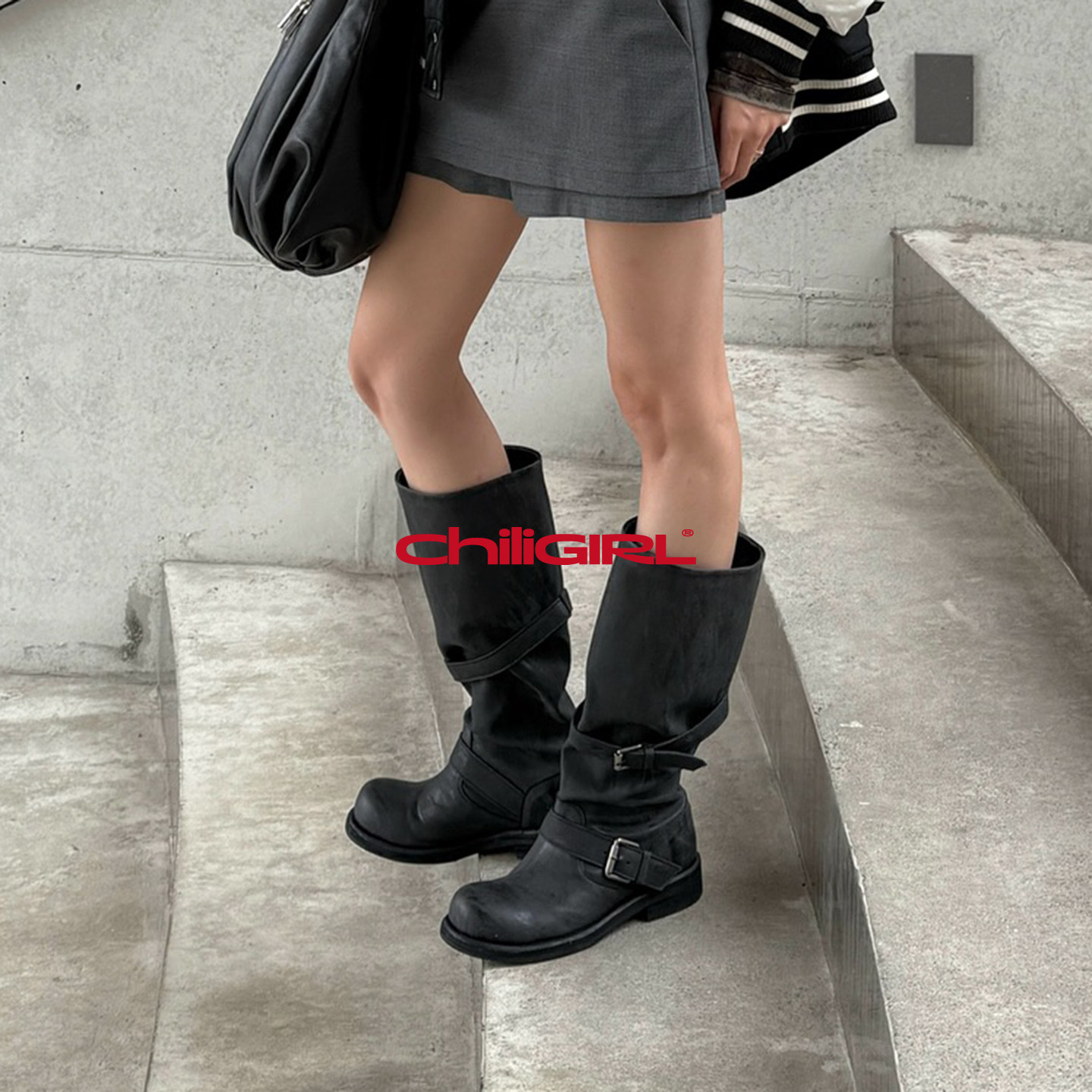 📚 CHILIGIRL 韩国堆堆靴宽松大头靴2025废土褶皱中跟不过膝宽筒长靴