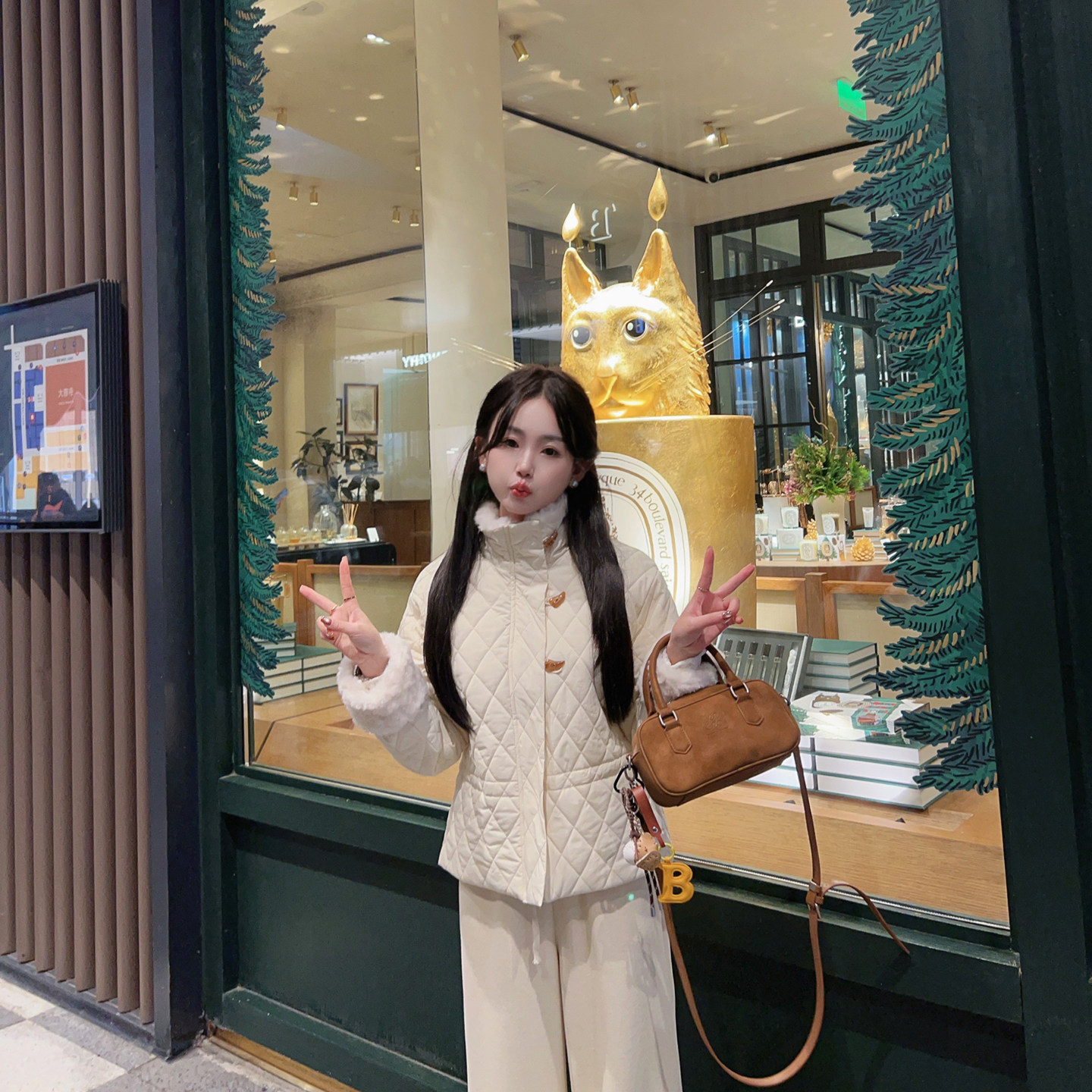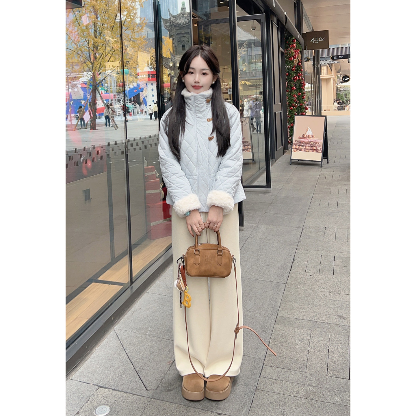 📚 小小家 小个子小码菱格纹毛毛领小短款可收腰棉服甜美翻领外套xs