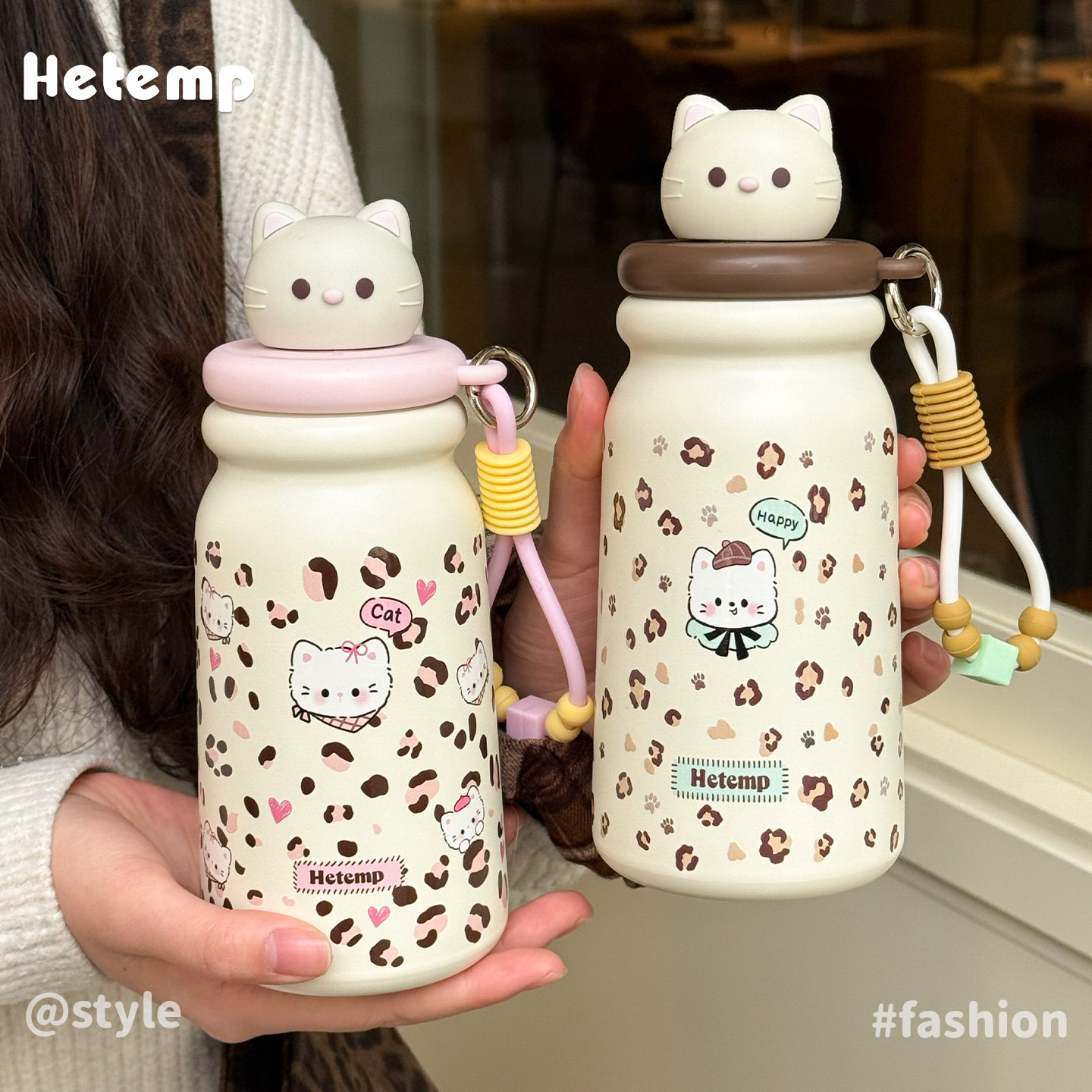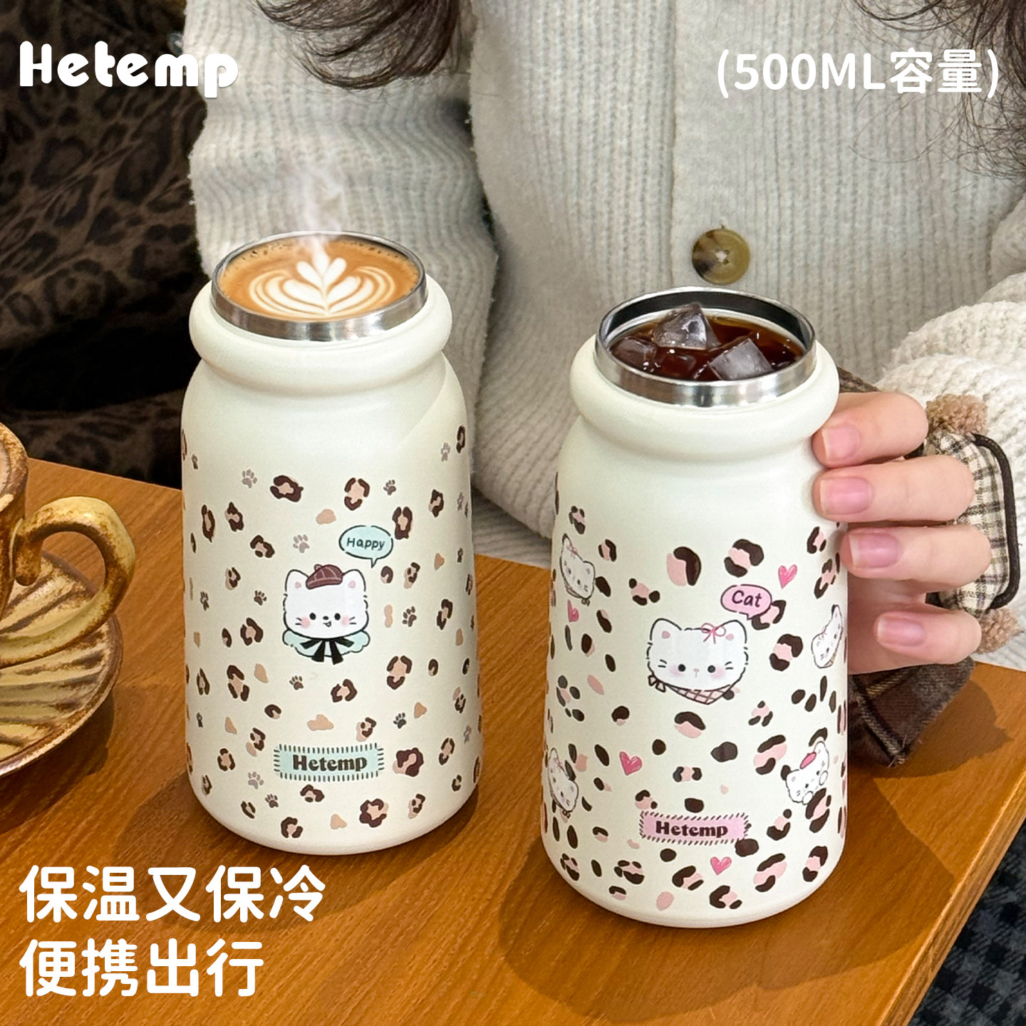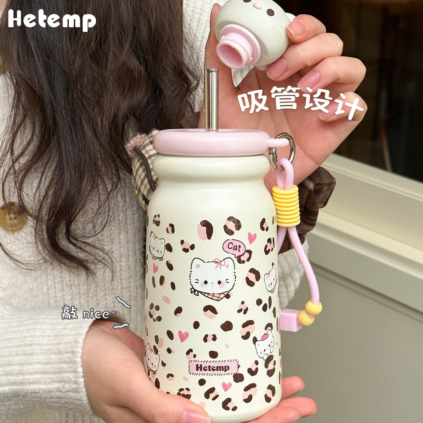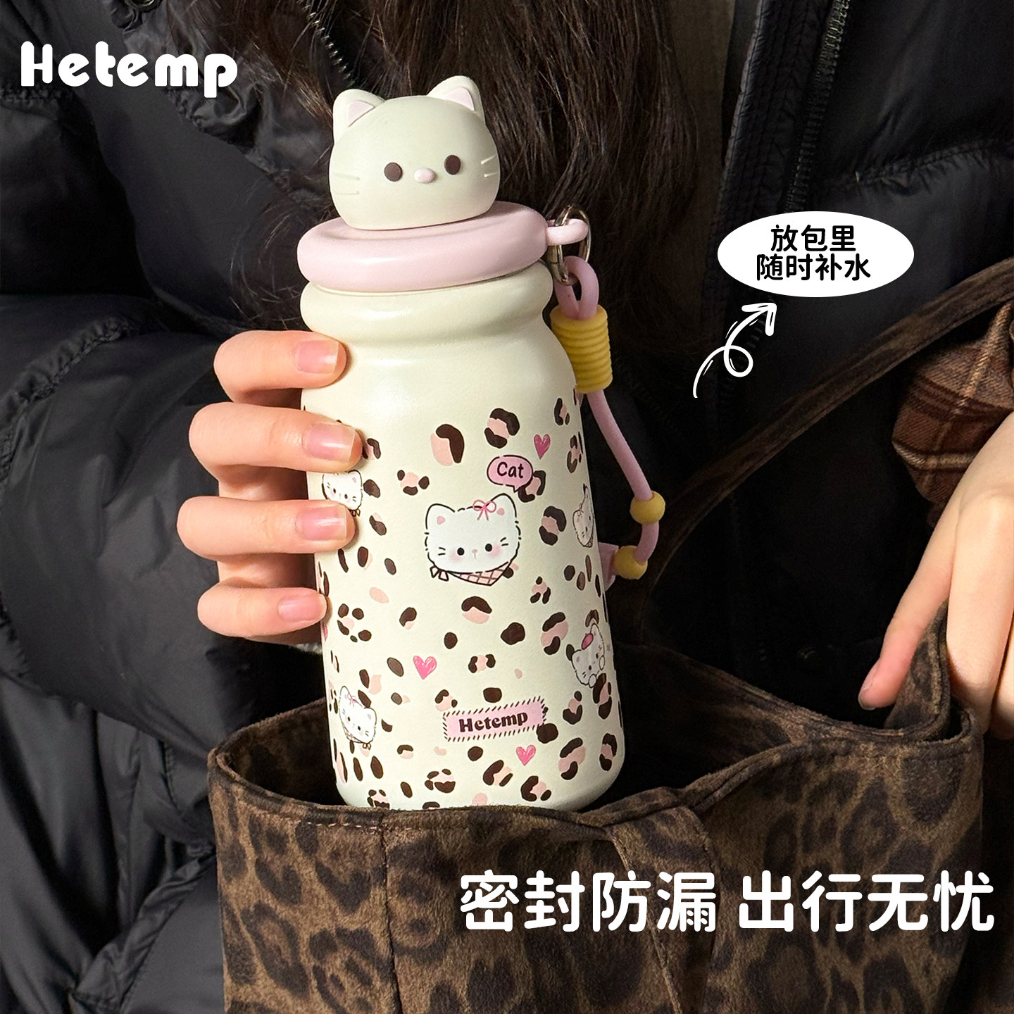 📚 恒度新款可爱猫咪豹纹保温杯女生高颜值学生上学大容量便携水杯子