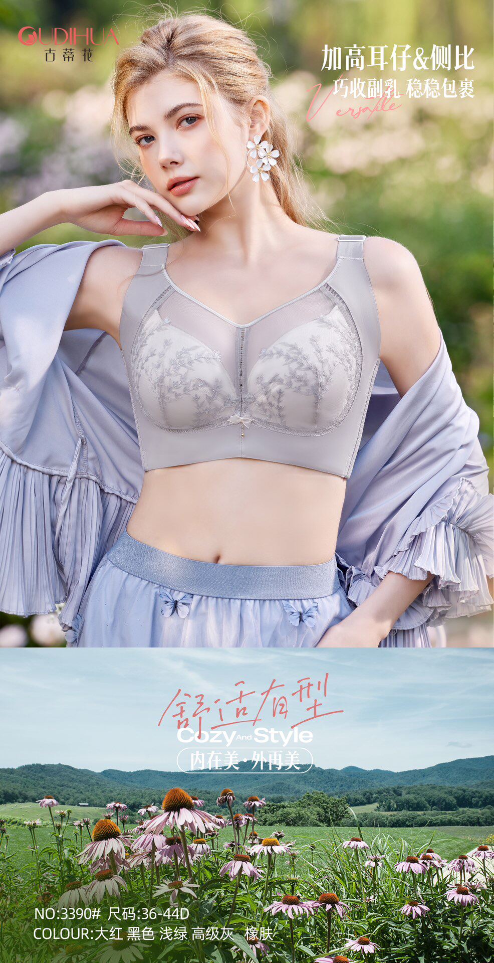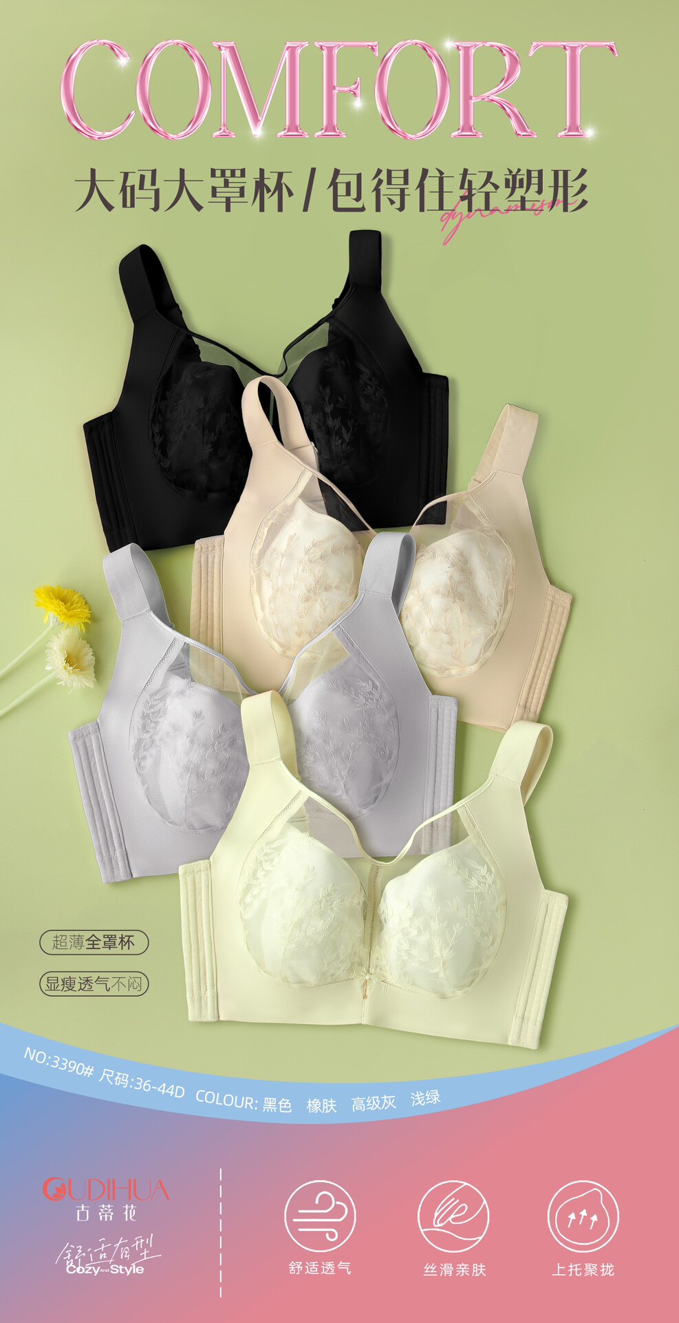 📚 新款品牌古蒂花文胸软钢圈透气超薄D杯大胸显小调整托聚内衣3390