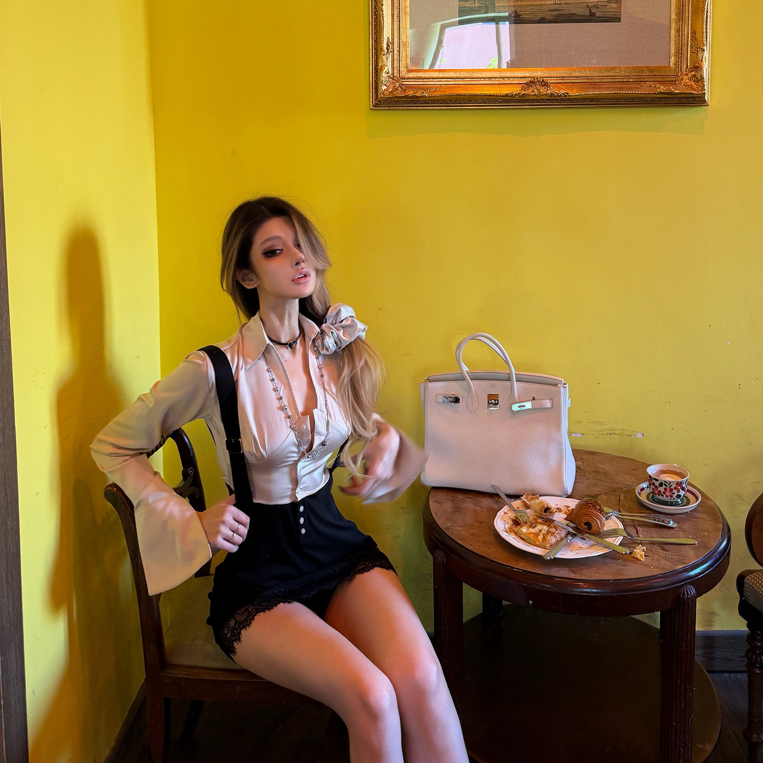 📚 PrettyDragon法式温柔风假两件缎面衬衫蕾丝背带气质长袖连衣裙女
