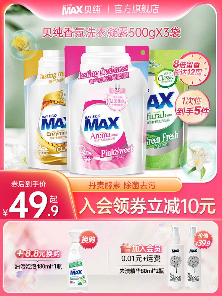 📚 贝纯MAX洗衣液袋装香味持久留香除菌除螨家用实惠装补充装浓缩
