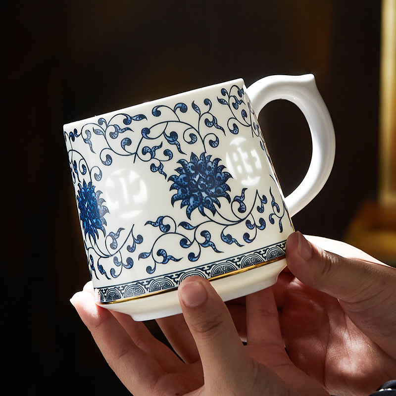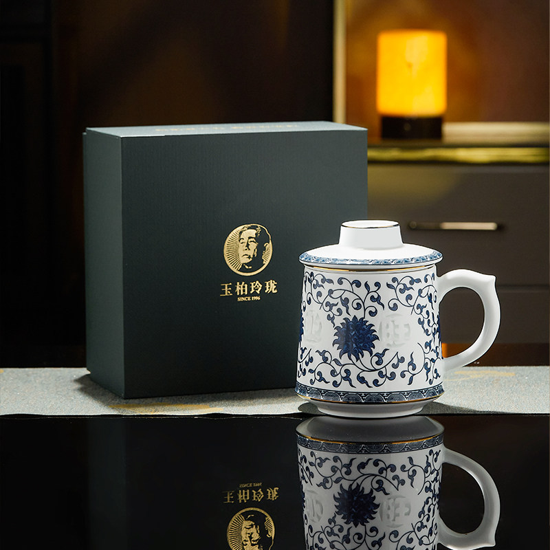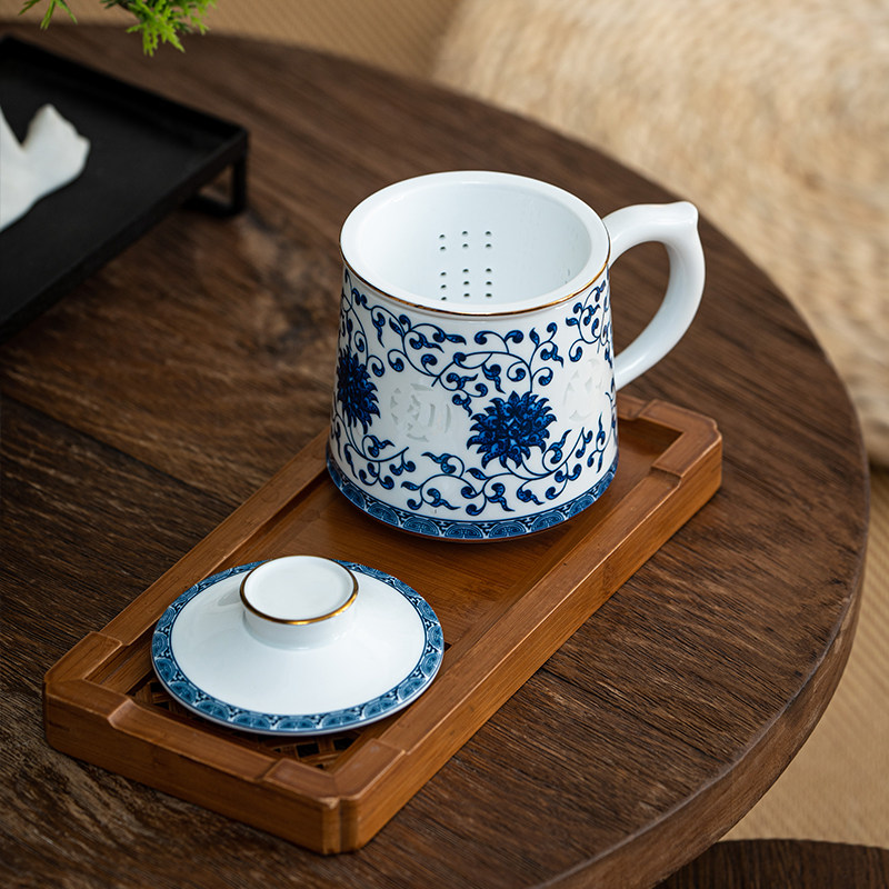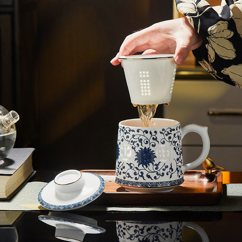 📚 景德镇陶瓷茶杯带盖茶水分离杯缠枝莲青花玲珑瓷器过滤泡茶杯礼物