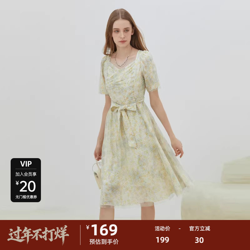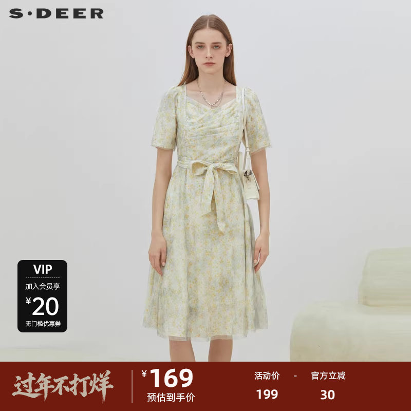 📚 S·DEER圣迪奥女装方领晕染网纱收腰泡泡袖连衣裙S223Z122Q