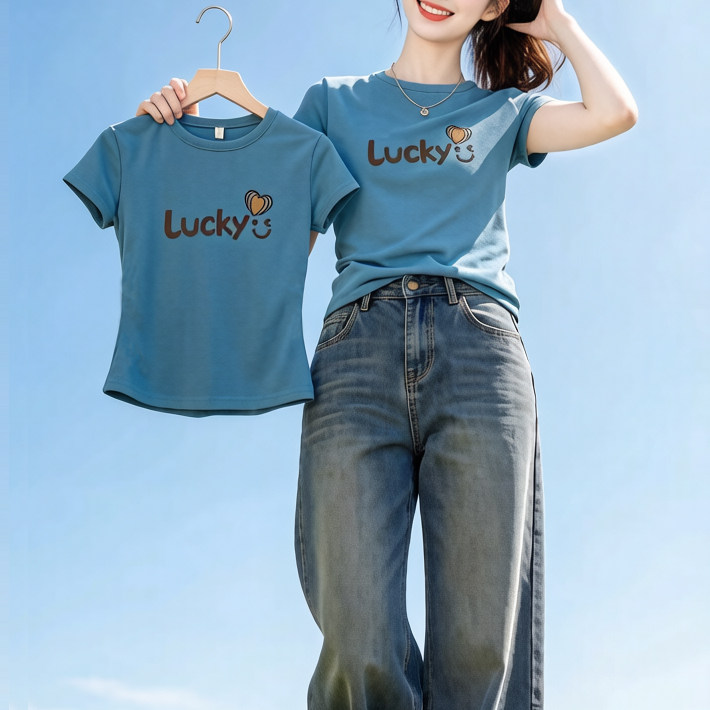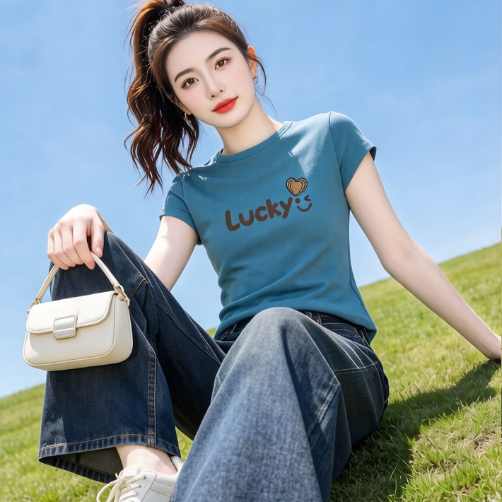 📚 海蓝色显白短袖t恤女夏季圆领时尚显瘦Lucky印花半袖体恤衫上衣潮