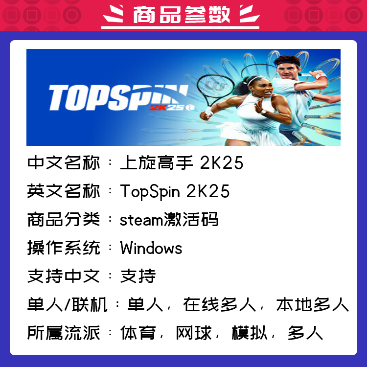 📚 steam正版国区cdk 上旋高手2K25 激活码 TopSpin 2K25 网球模拟