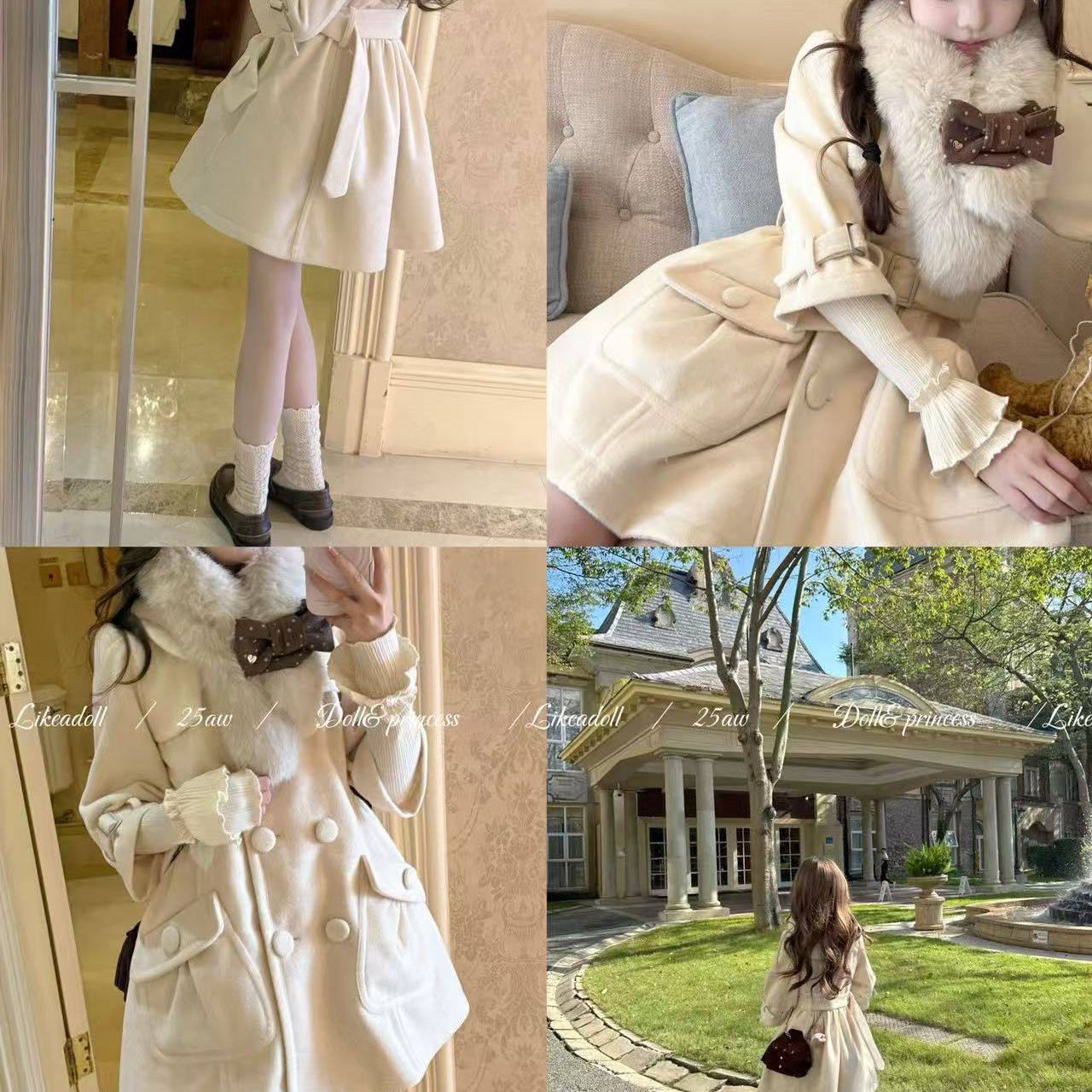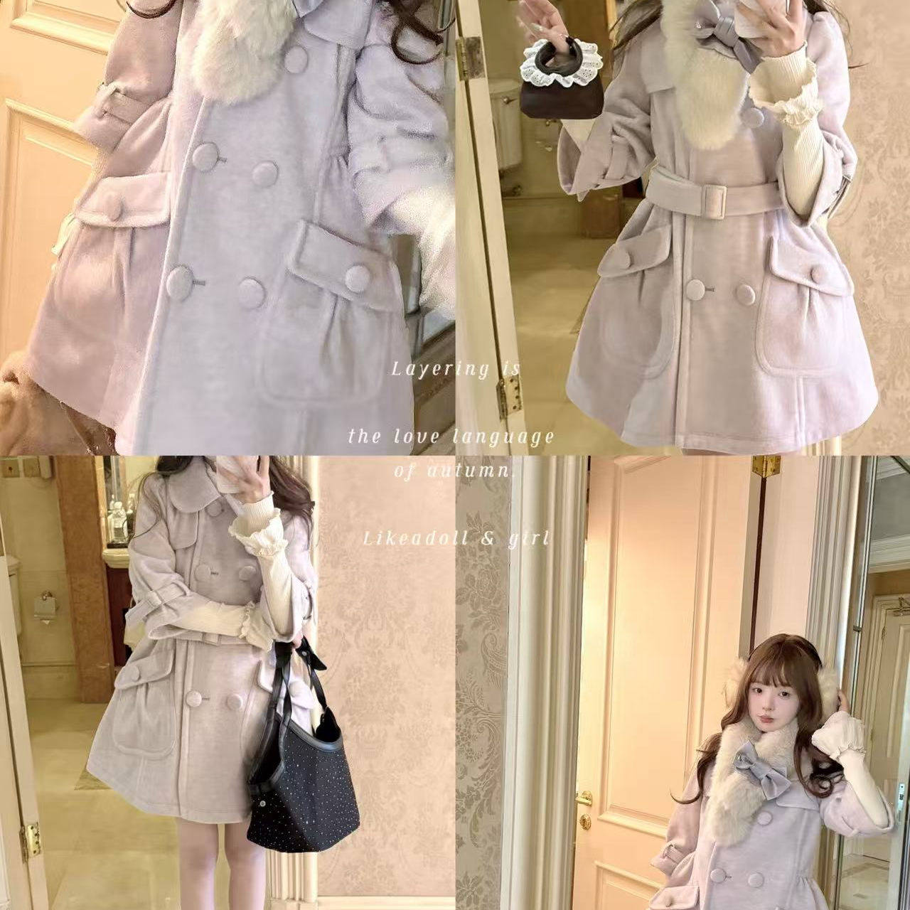 📚 DOLL原创-古典千金-杏色浅紫色呢中长款大衣女冬季设计感宽松外套