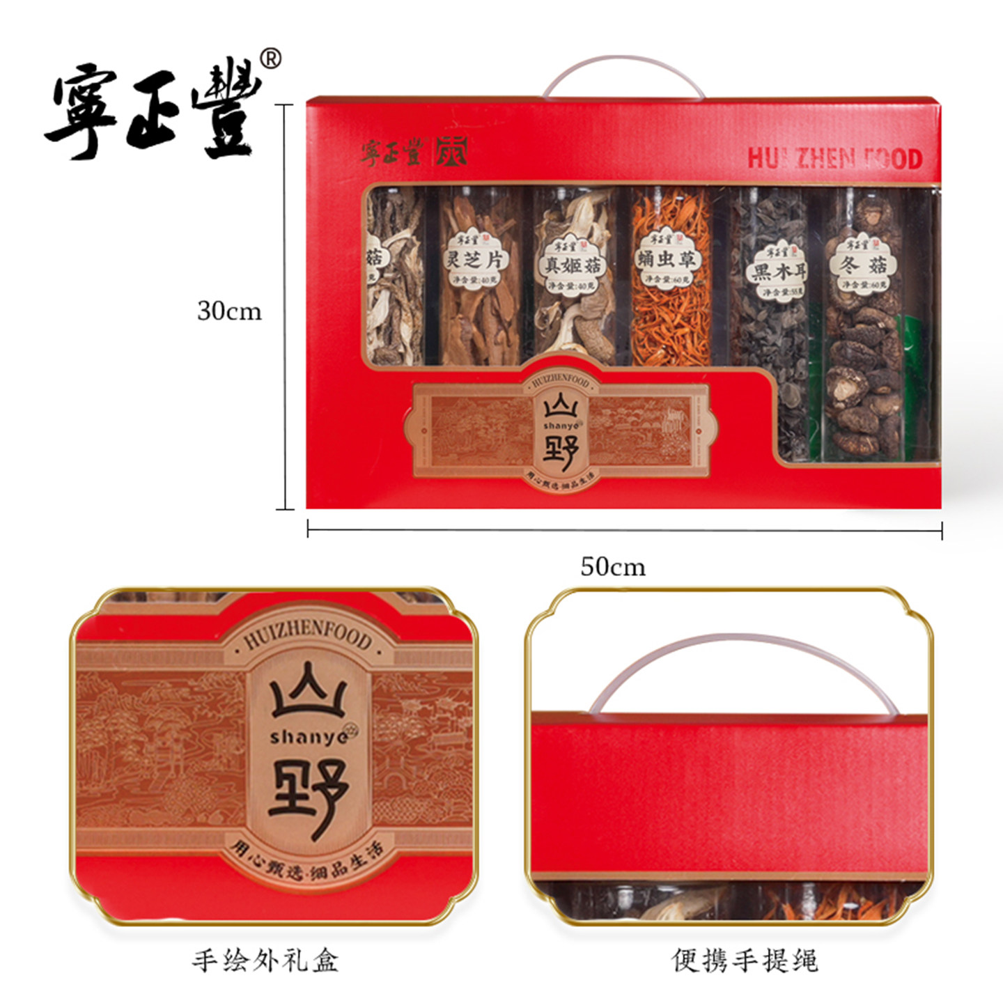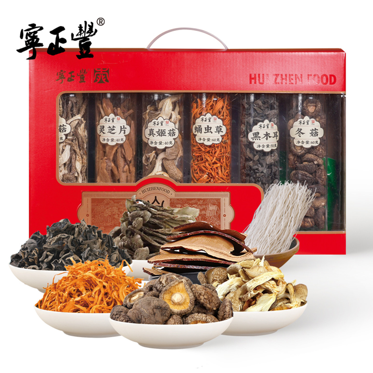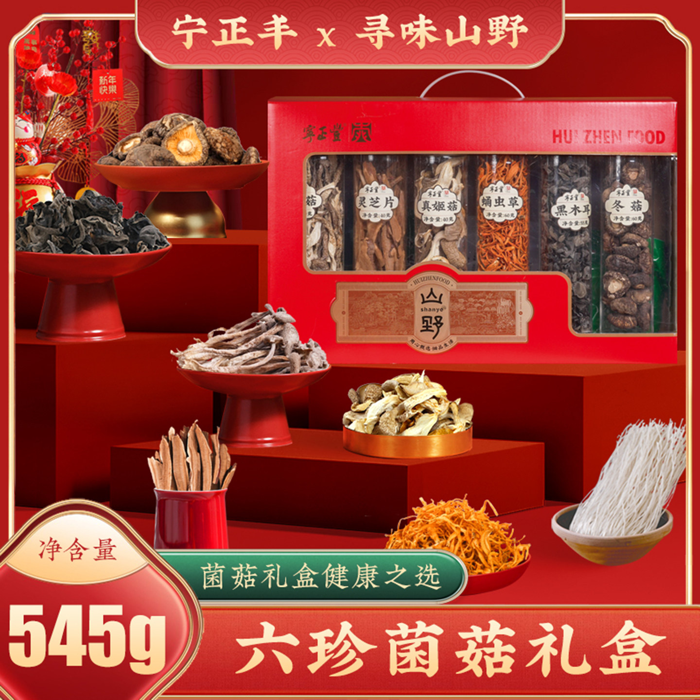 📚 寻味山野六珍礼盒冬菇黑木耳真姬菇鹿茸菇蛹虫草灵芝片葛粉条545g
