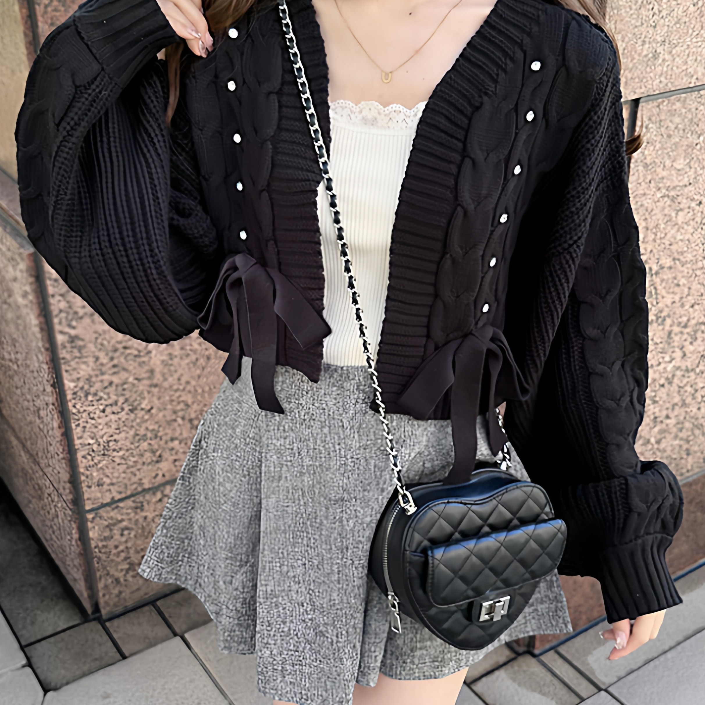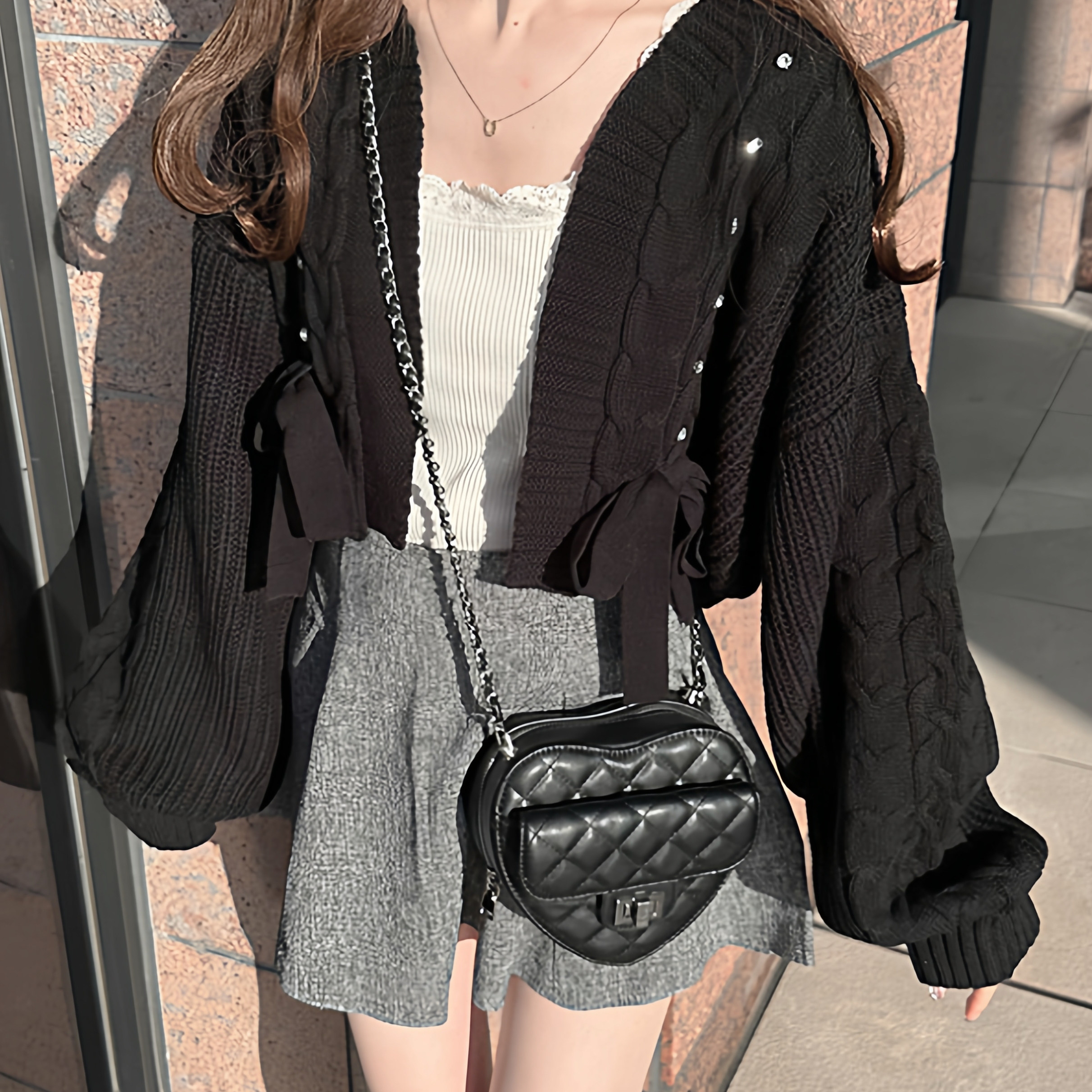 📚 现*花糖家 日系定制GRL清楚系灯笼袖蝴蝶结系带短款针织开衫tt010