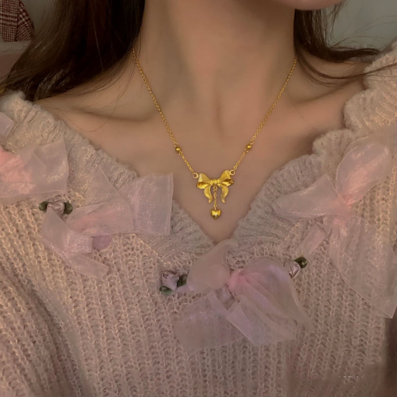 📚 调太幅18K金蝴蝶结项链 女在逃公主纯银镀黄金色爱心锁骨链高级感