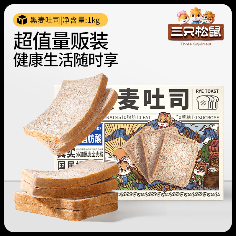📚 【三只松鼠_全麦面包1kg】黑麦吐司0脂0蔗糖健康健身代餐饱腹早餐