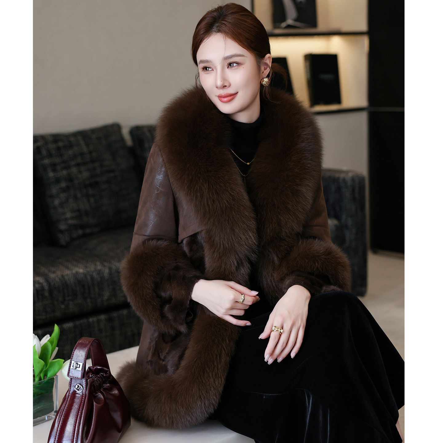 📚 海宁皮草女修身中长款外套狐狸毛领韩版2025冬新款獭兔毛皮毛一体