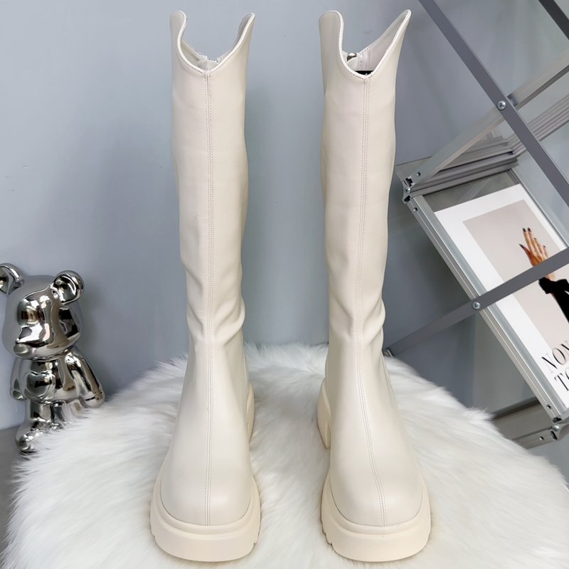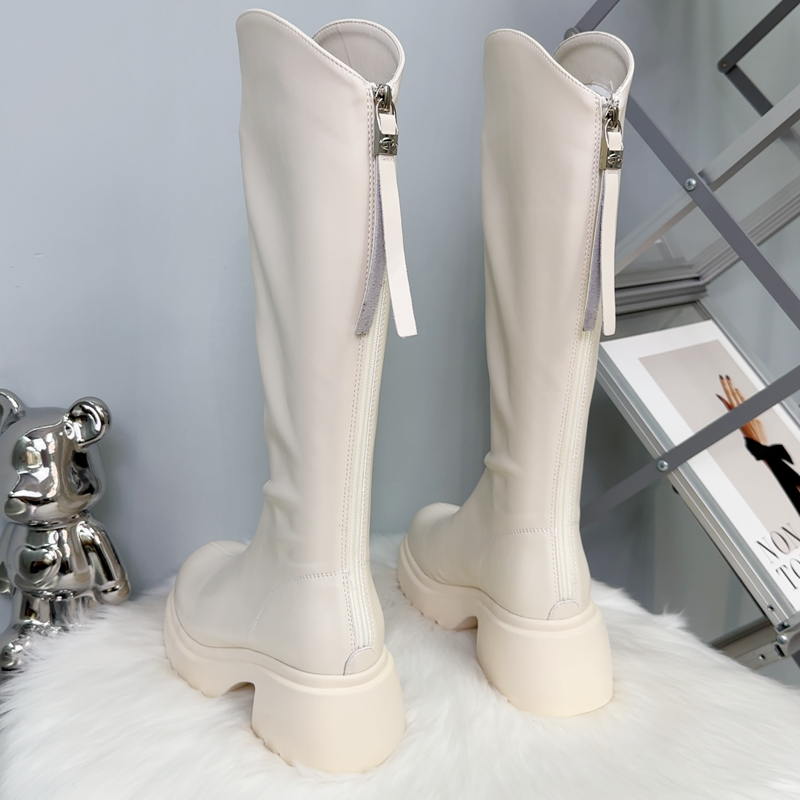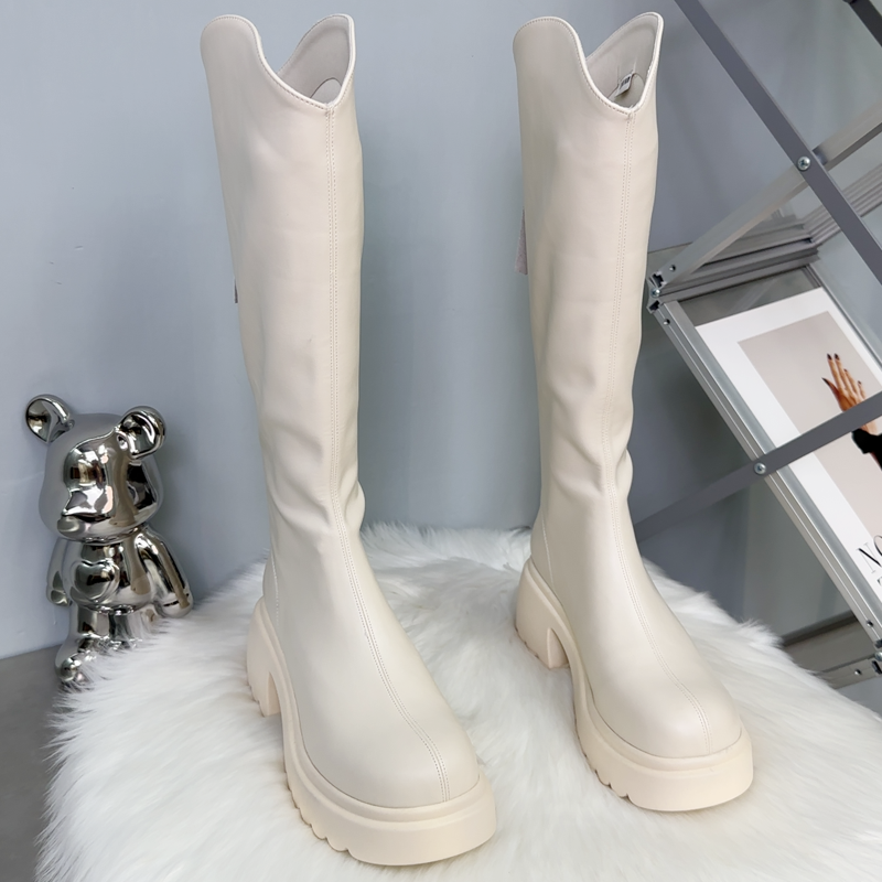 📚 2025年英伦风时装靴女厚底白色长靴子后拉链骑士靴加绒保暖弹力靴