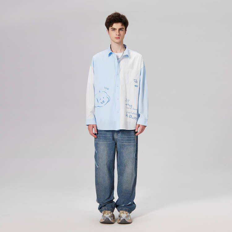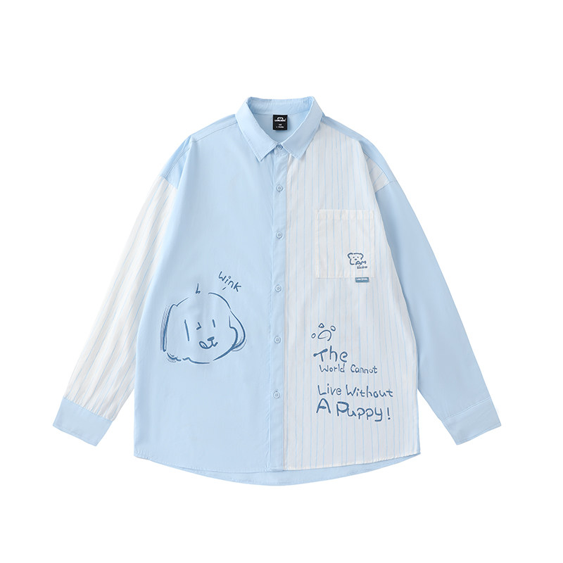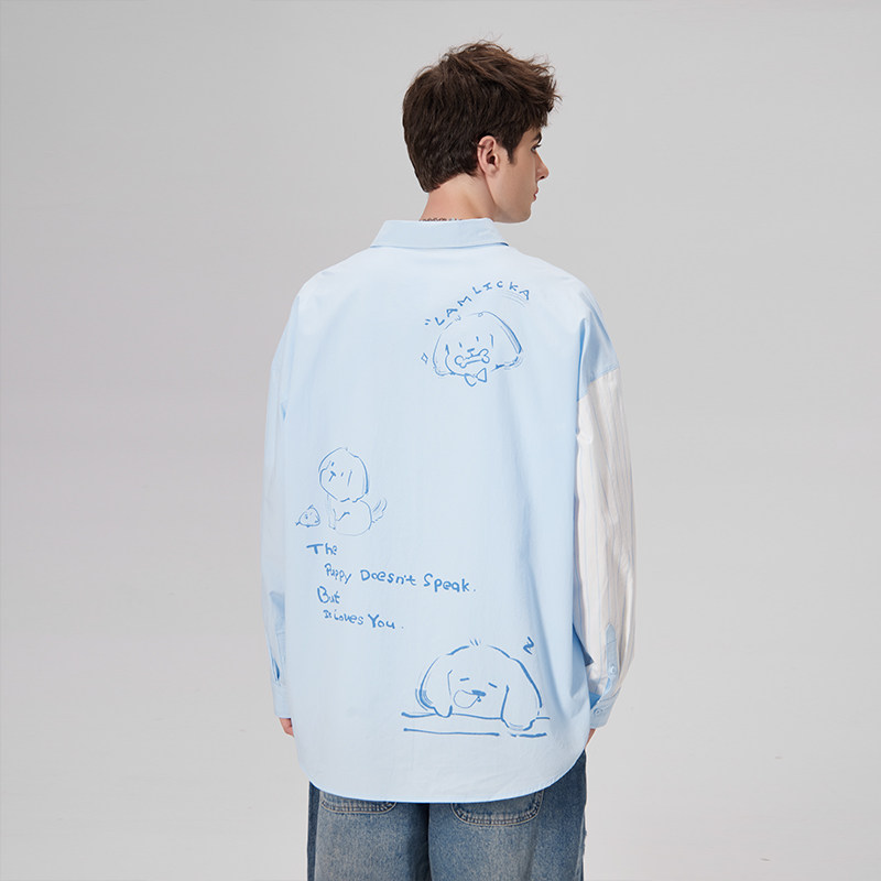 📚 LAMLICKA周深同款小狗拼接撞色长袖衬衫男翻领休闲薄衬衣外套宽松