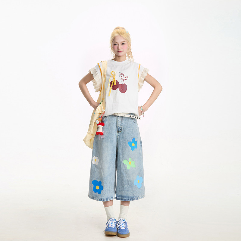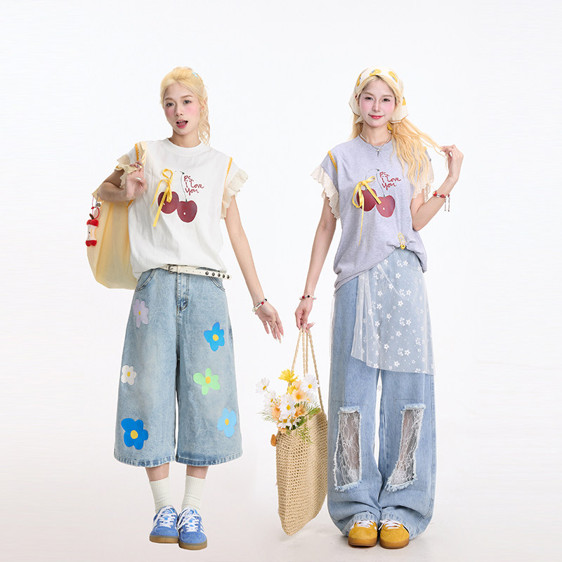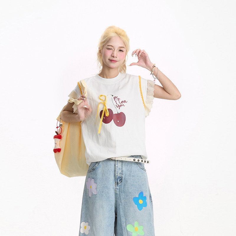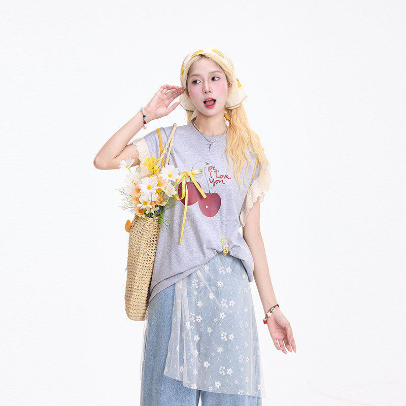 📚 NERESUM樱桃印花小飞袖短袖T恤女蕾丝拼接设计感宽松百搭小众上衣