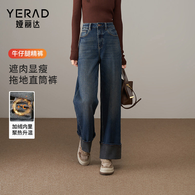 📚 娅丽达加绒直筒裤女2025冬季时髦显瘦宽卷边法棍裤新款拖地牛仔裤