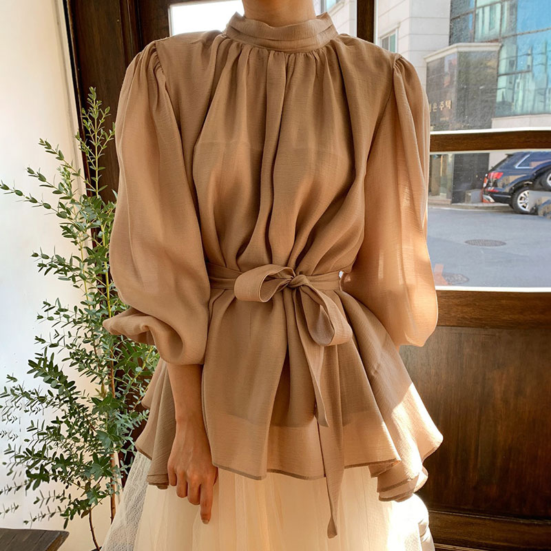 📚 韩国chic秋季气质百搭立领绑带收腰显瘦纯色灯笼袖雪纺衬衫上衣女