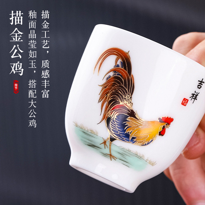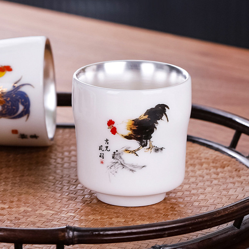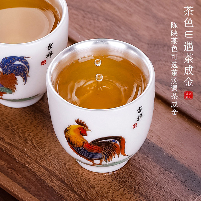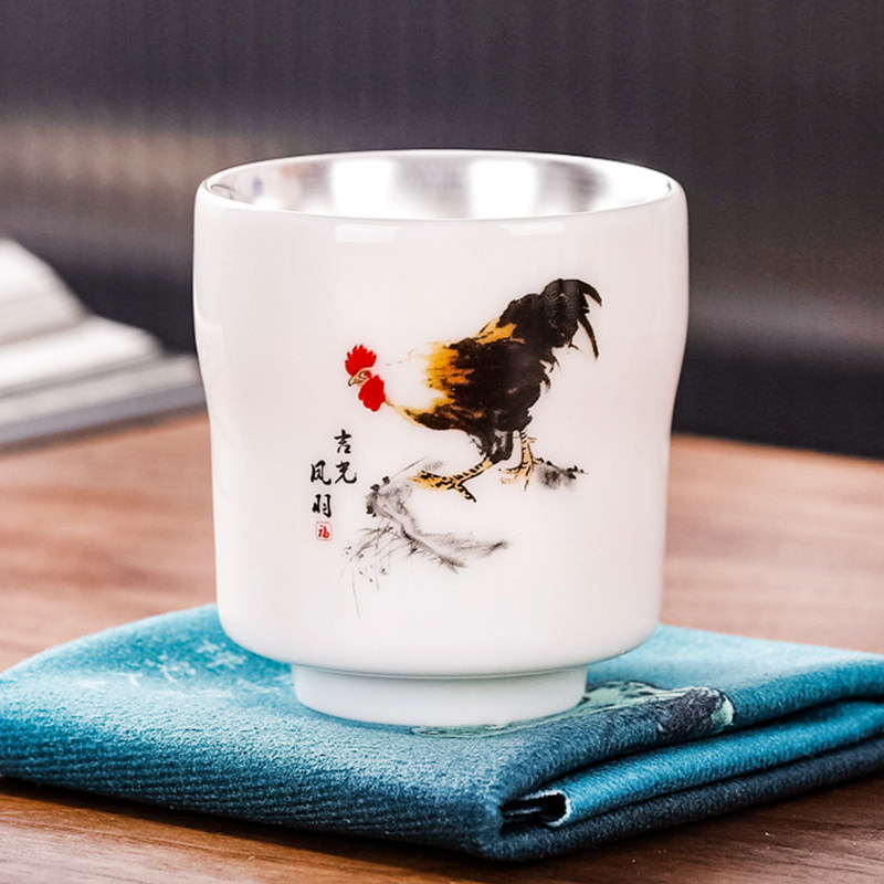 📚 银杯子999纯银茶杯主人杯公鸡杯陶瓷建盏单杯镶银茶盏纯手工套装
