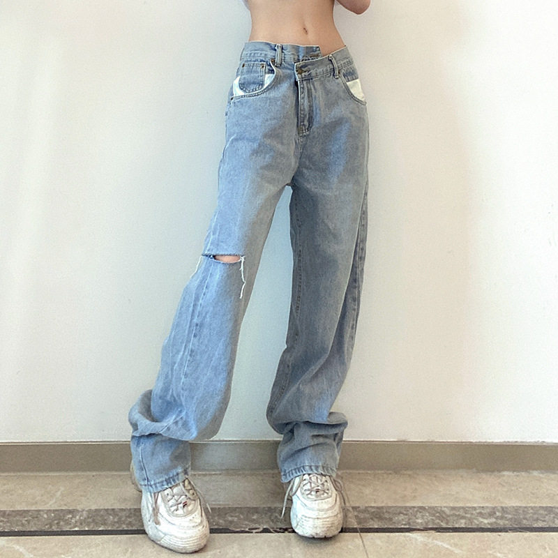 📚 Hot girl personality ripped jeans women high waist拖地直筒裤