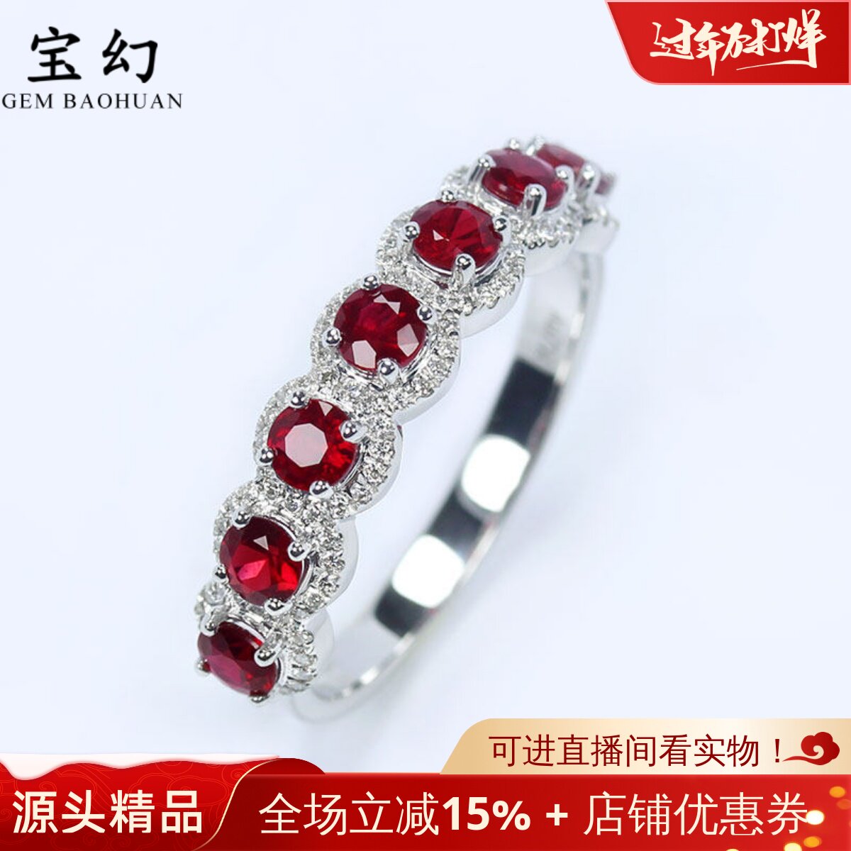 📚 18K白金天然鸽血红宝石满镶钻石戒指 正红色圆形排戒正品手饰女款