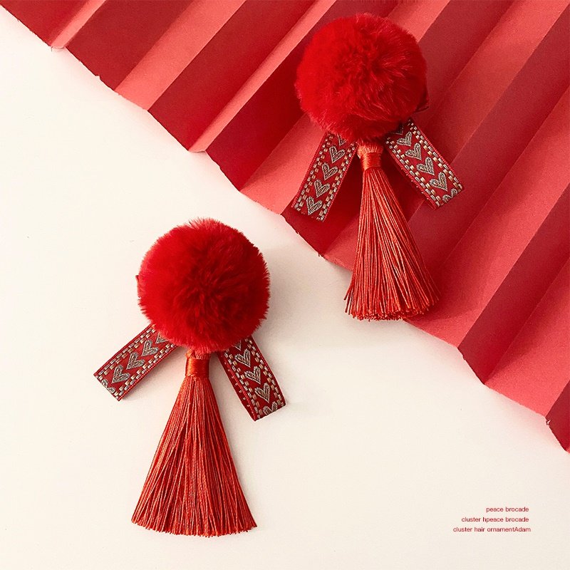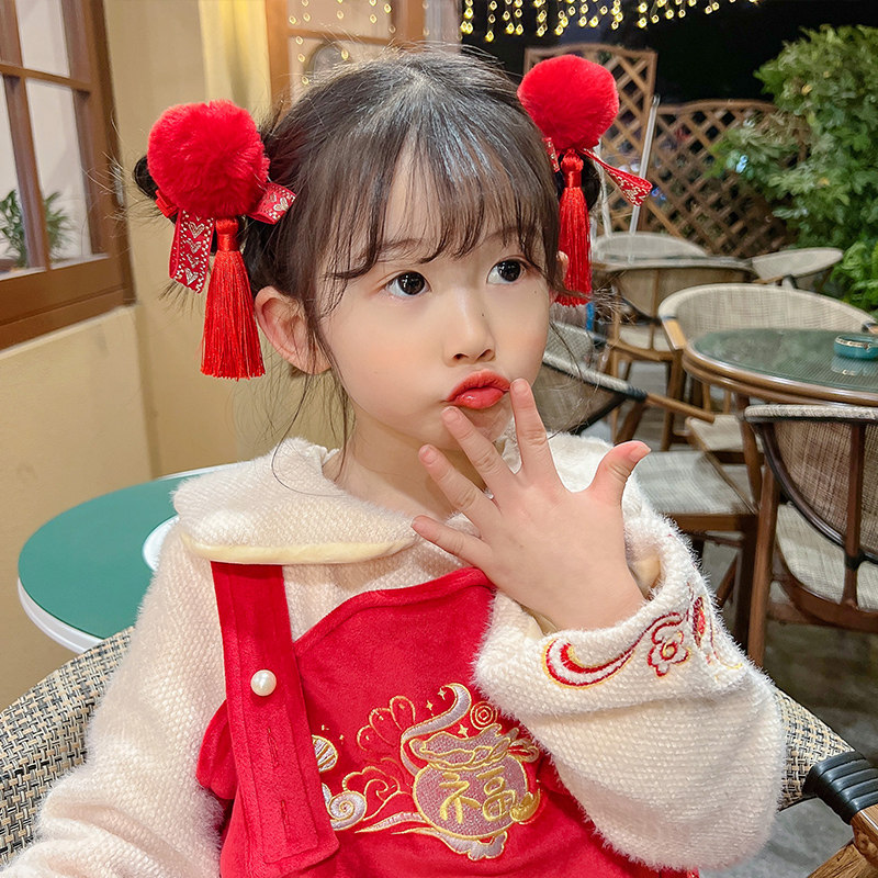 📚 新年儿童毛球发夹小女孩中国风红色毛绒流苏发卡女童过年汉服头饰