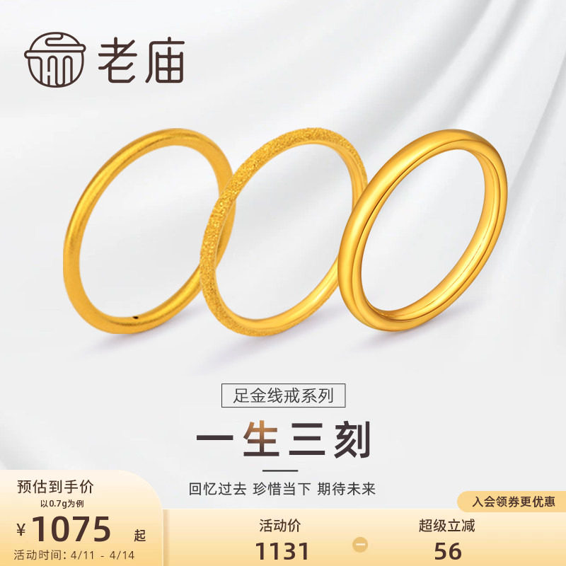 📚 老庙黄金3D素圈戒指足金一生三刻婚戒古法5G情侣泥鳅背送礼物官方
