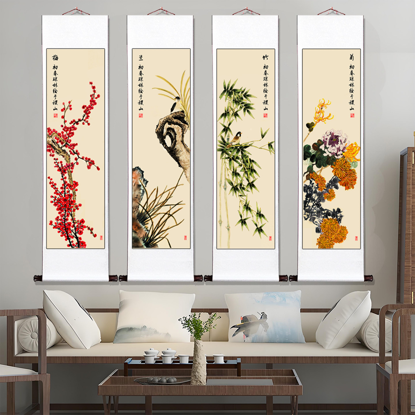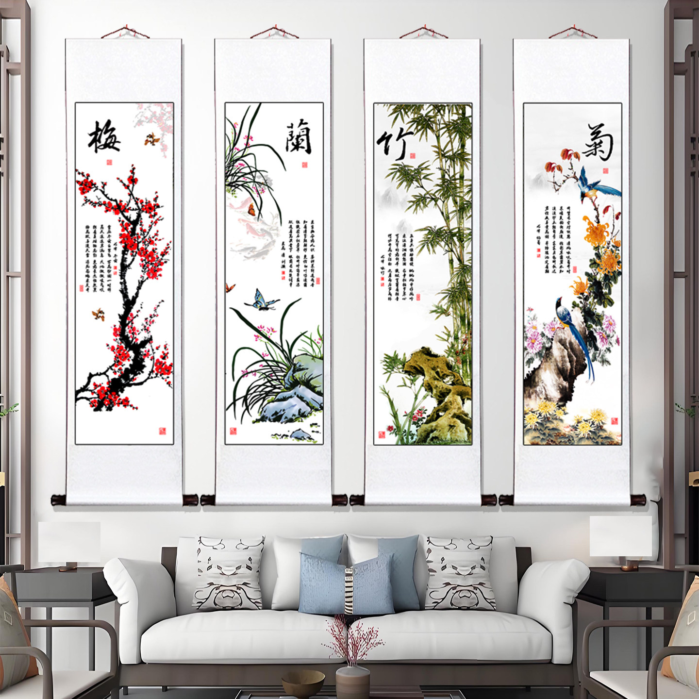 📚 新中式字画客厅装饰壁画四条屏长条国画四联梅兰竹菊挂画卷轴字画