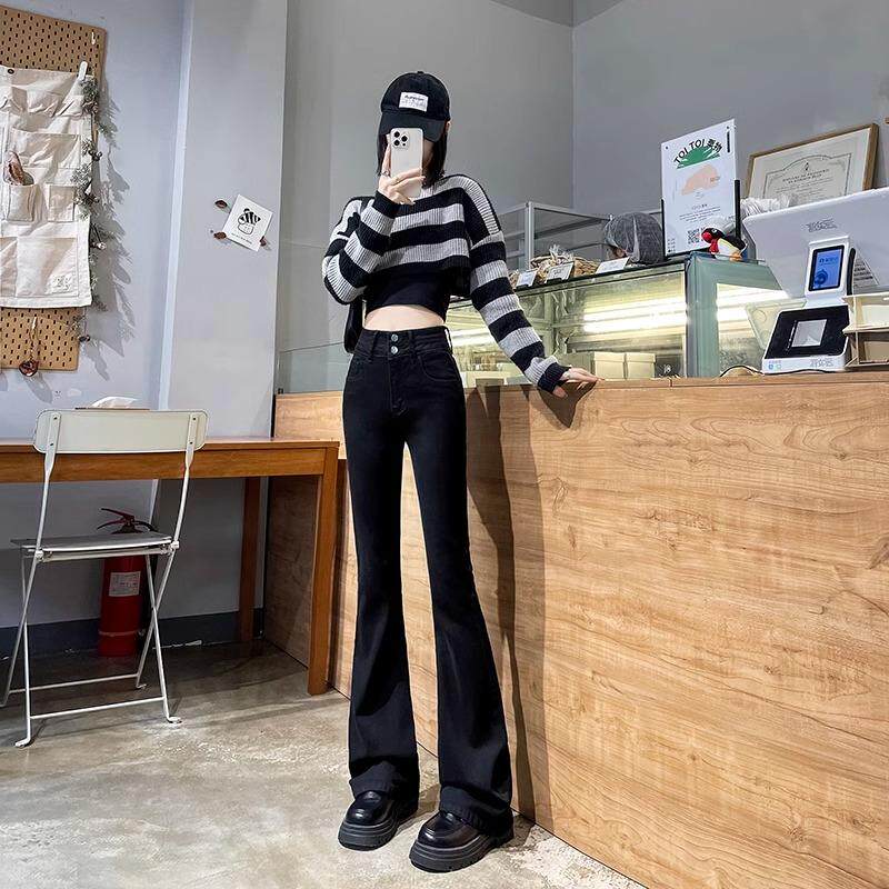 📚 黑色双扣高腰加绒微喇牛仔裤女秋冬加绒修身弹力小个子马蹄喇叭裤