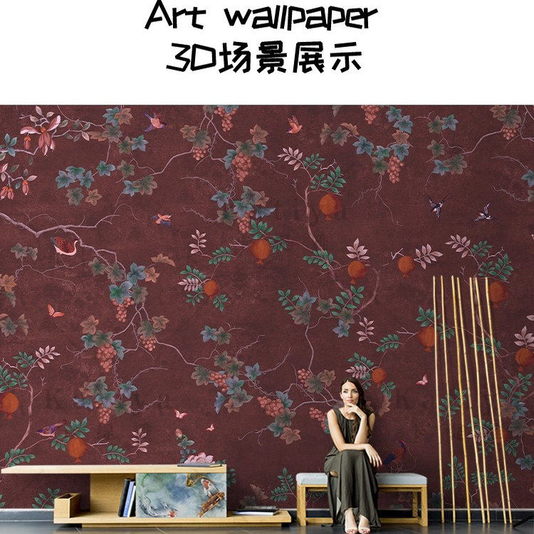 📚 Katiya手绘石榴轻奢美式复古电视背景墙布卧室碎花壁纸故宫红壁画