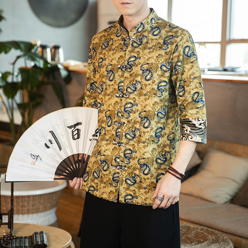 📚 中国风夏天唐装男长袖衬衫棉麻汉服立领盘扣国潮上衣龙袍大码衬衣