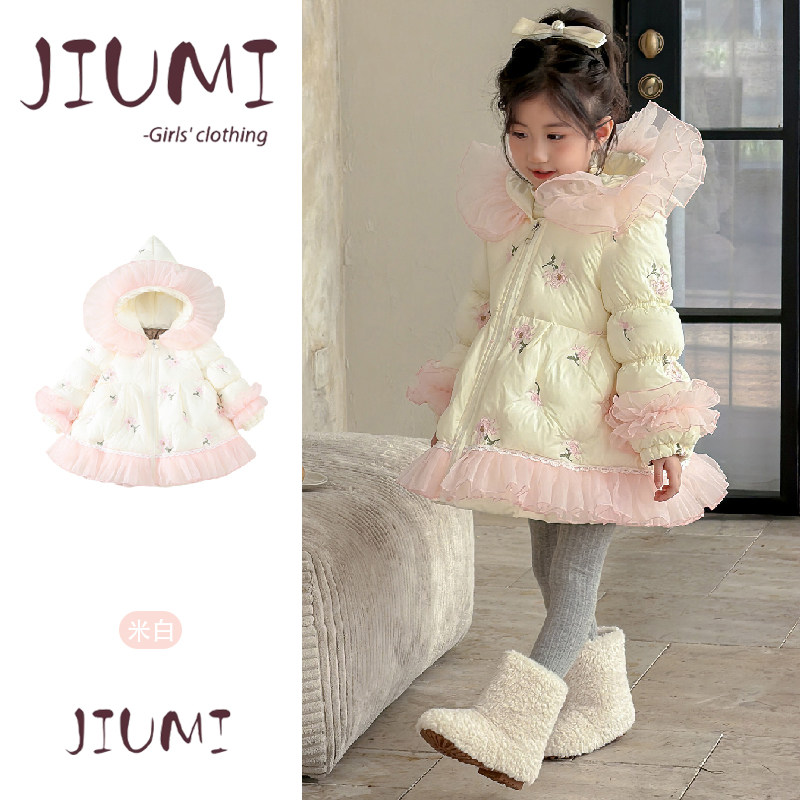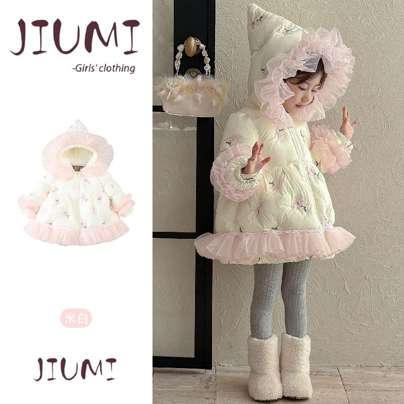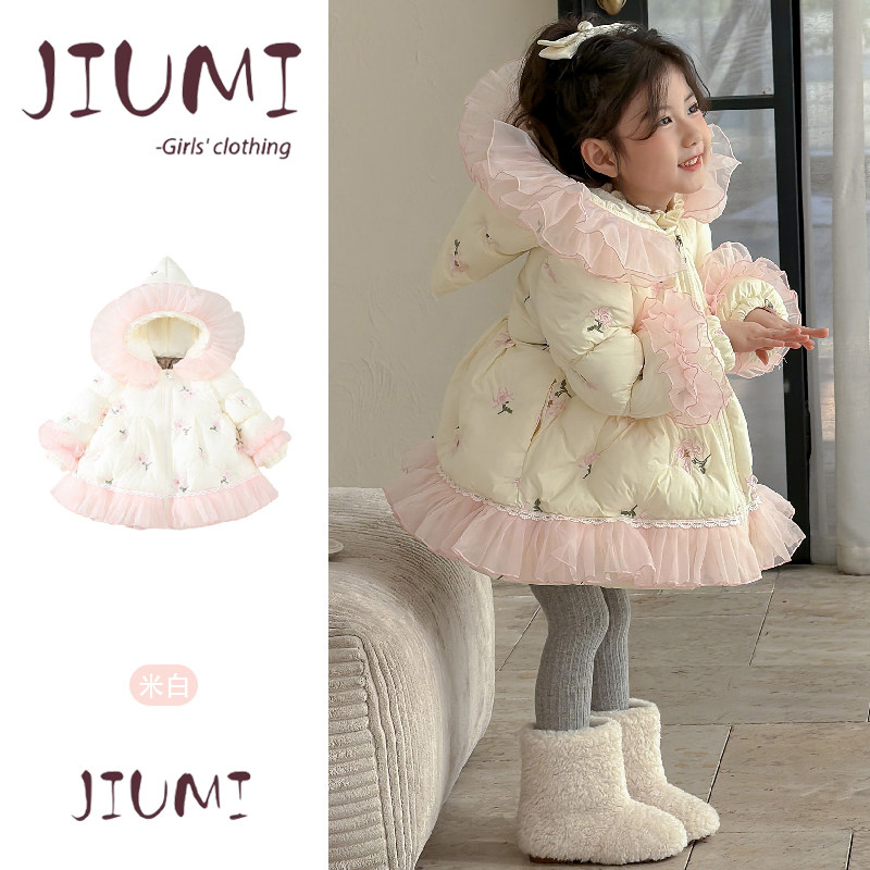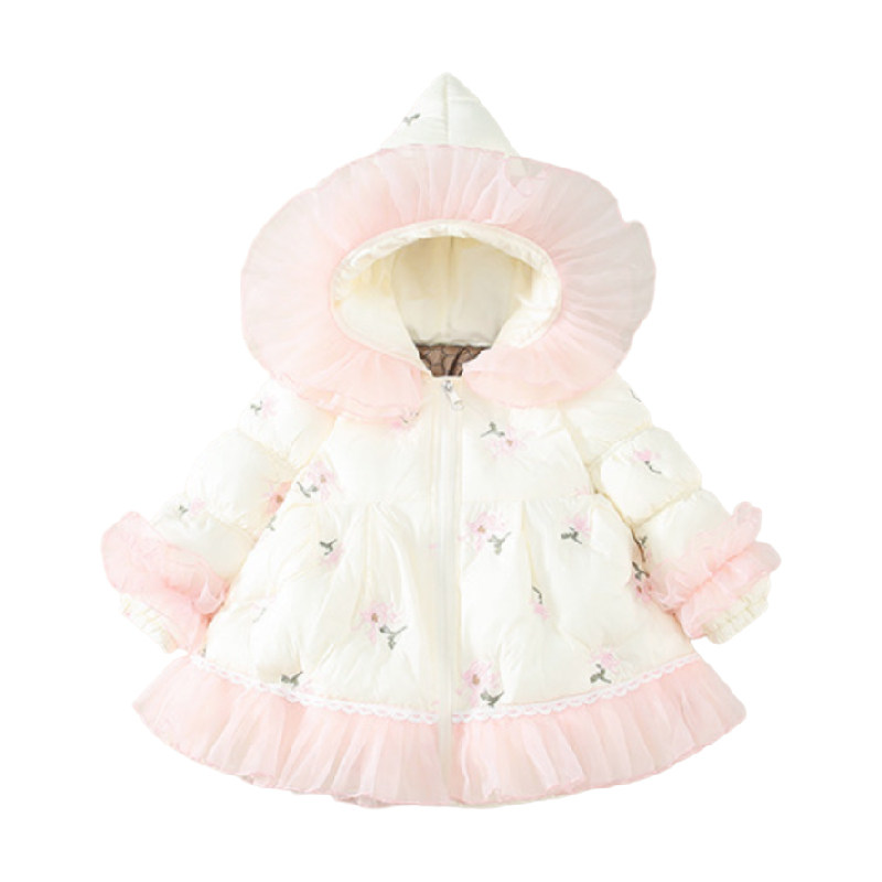 📚 女童冬季小花甜美可爱羽绒服女宝宝加厚连帽花边中长款保暖棉外套