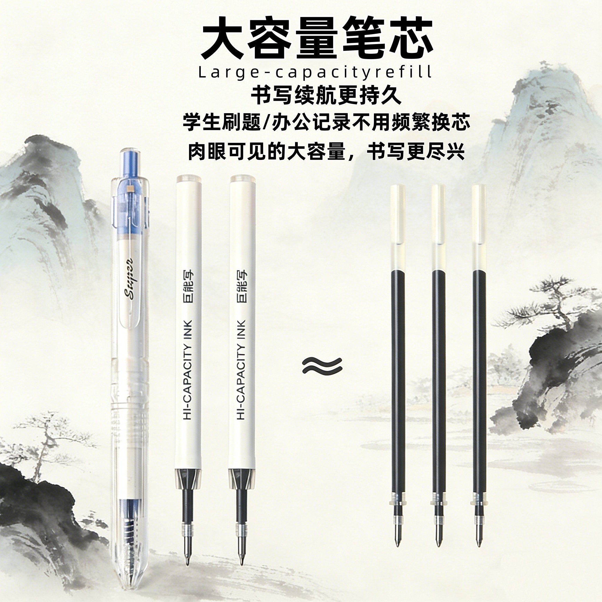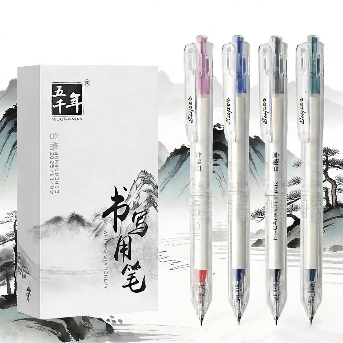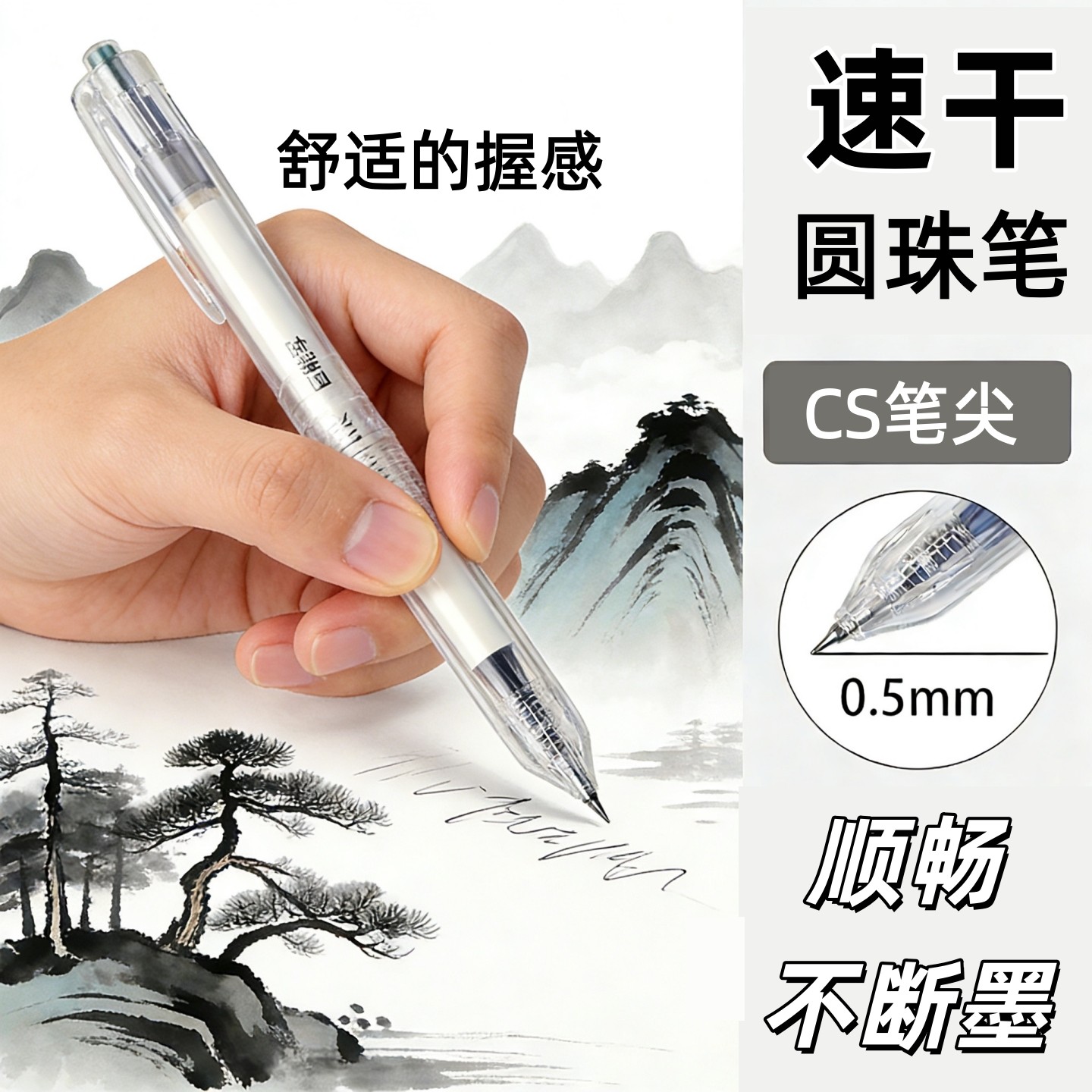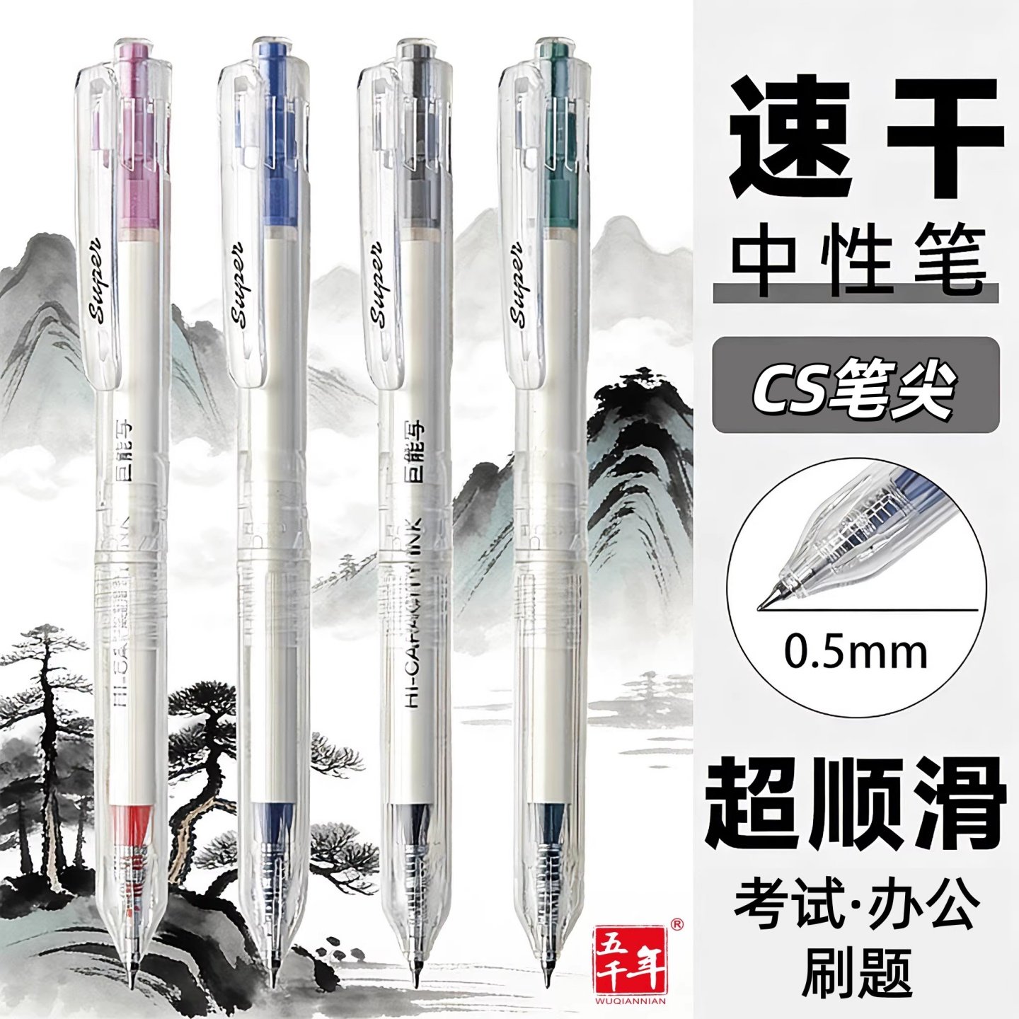 📚 五千年按动中性笔0.5mm速干大容量超顺滑考试办公刷题笔四色圆珠笔黑红蓝绿色初高中小学生专用笔高颜值风笔