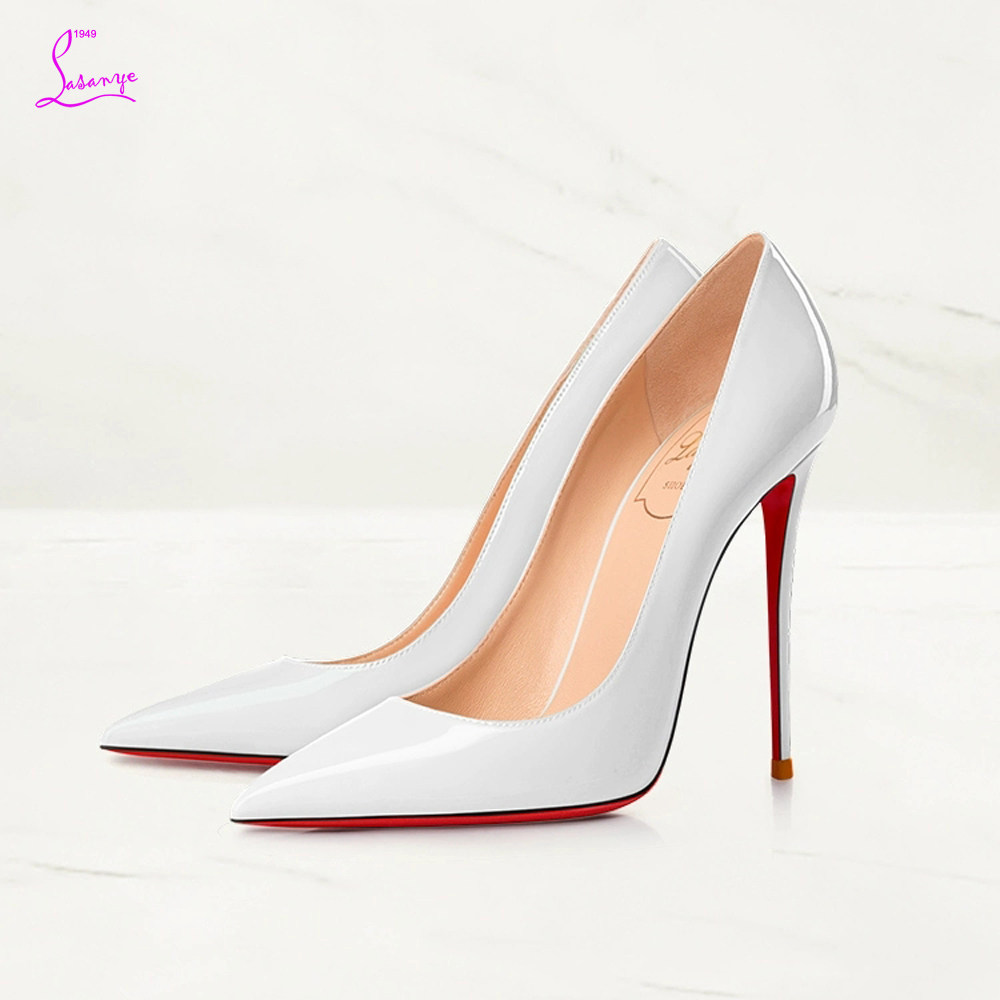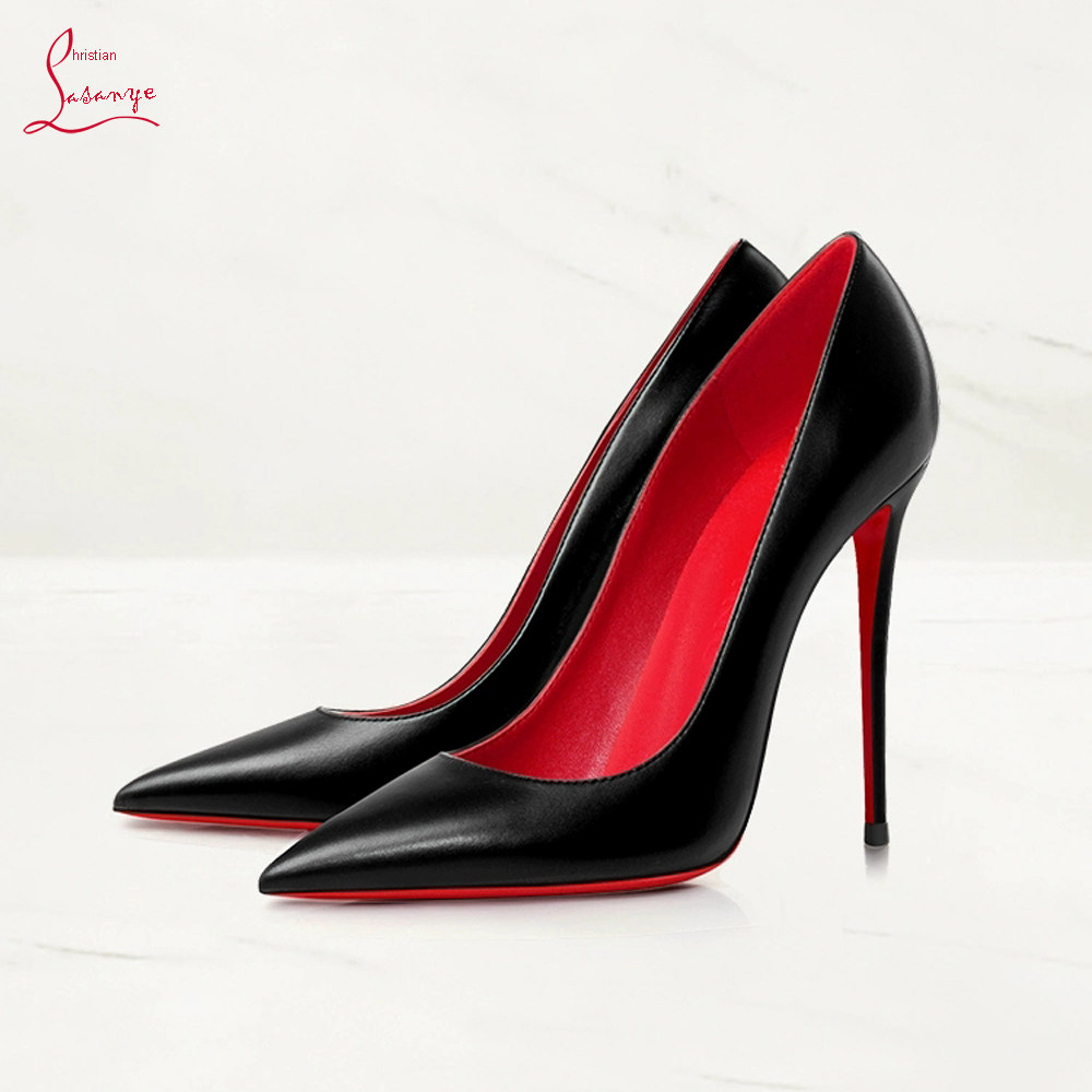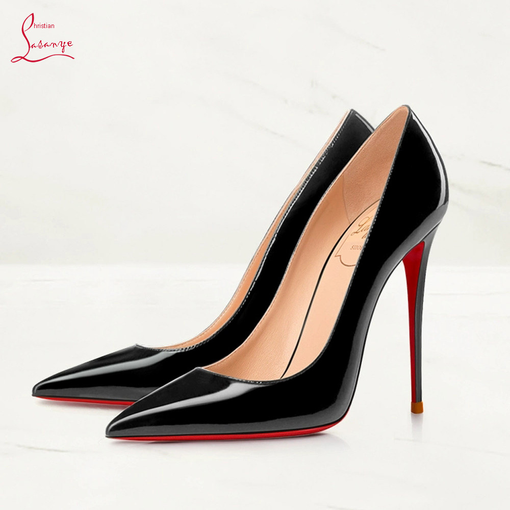 📚 Lasanye新款黑色牛反绒CL红底高跟鞋细跟浅口真皮漆皮尖头单鞋女
