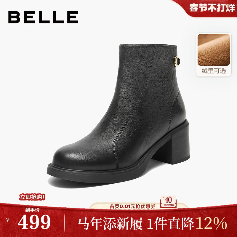 📚 百丽复古褶皱超软羊皮显瘦短靴女鞋真皮加绒高跟时装靴B2823DD5