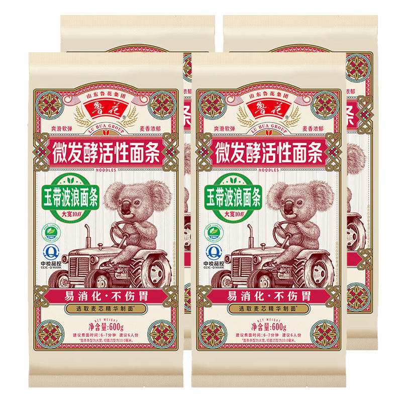 📚 鲁花考拉微发酵活性玉带波浪面条600g*4袋大宽挂面10.0热干面早餐