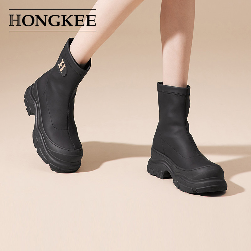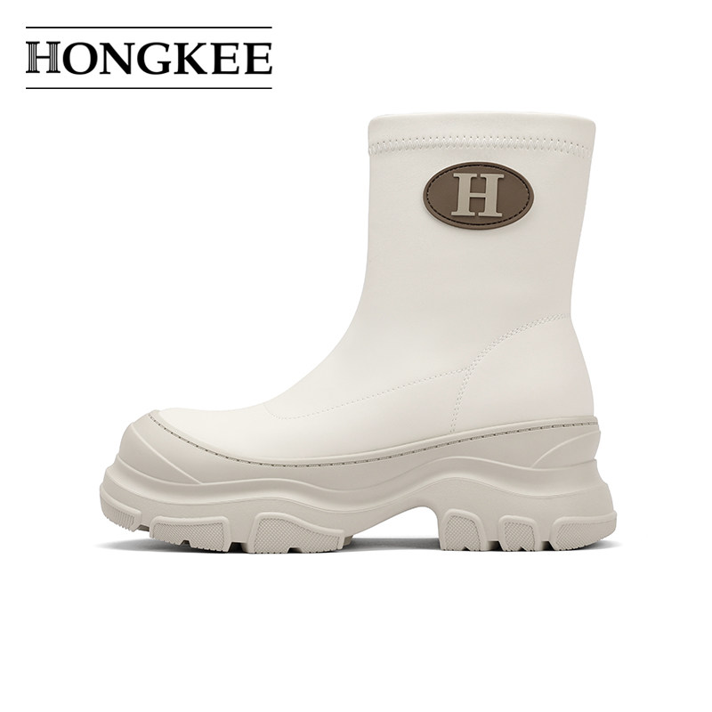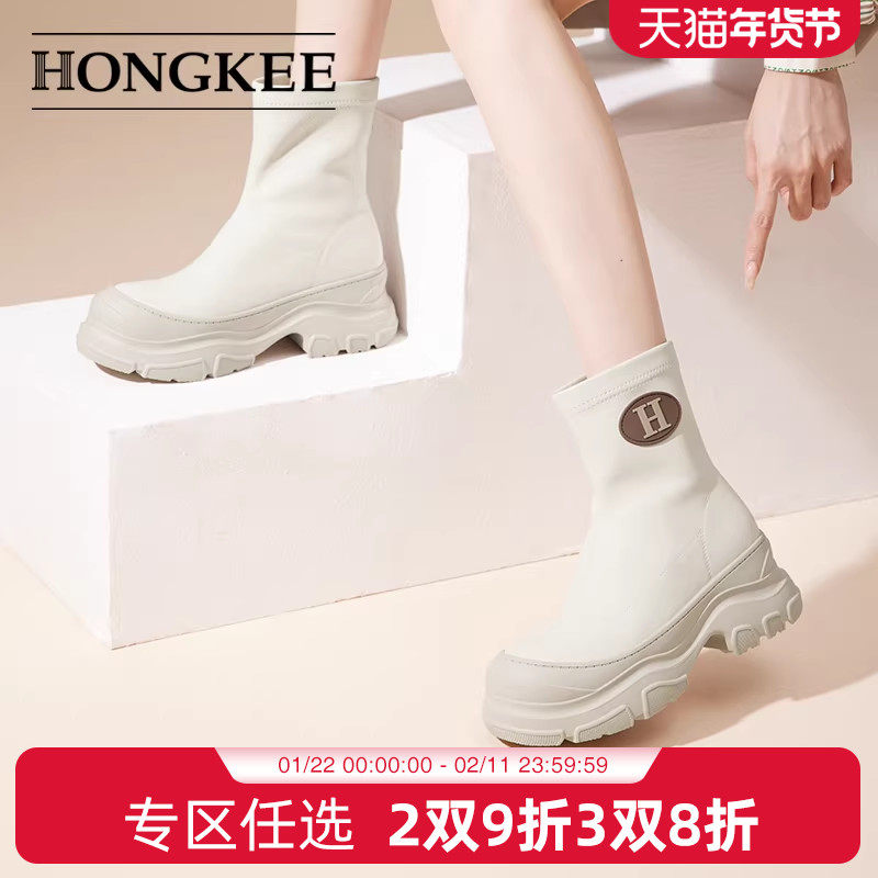 📚 Hongkee/红科短靴女2024秋冬女鞋厚底套筒弹力女靴白靴子H804D412