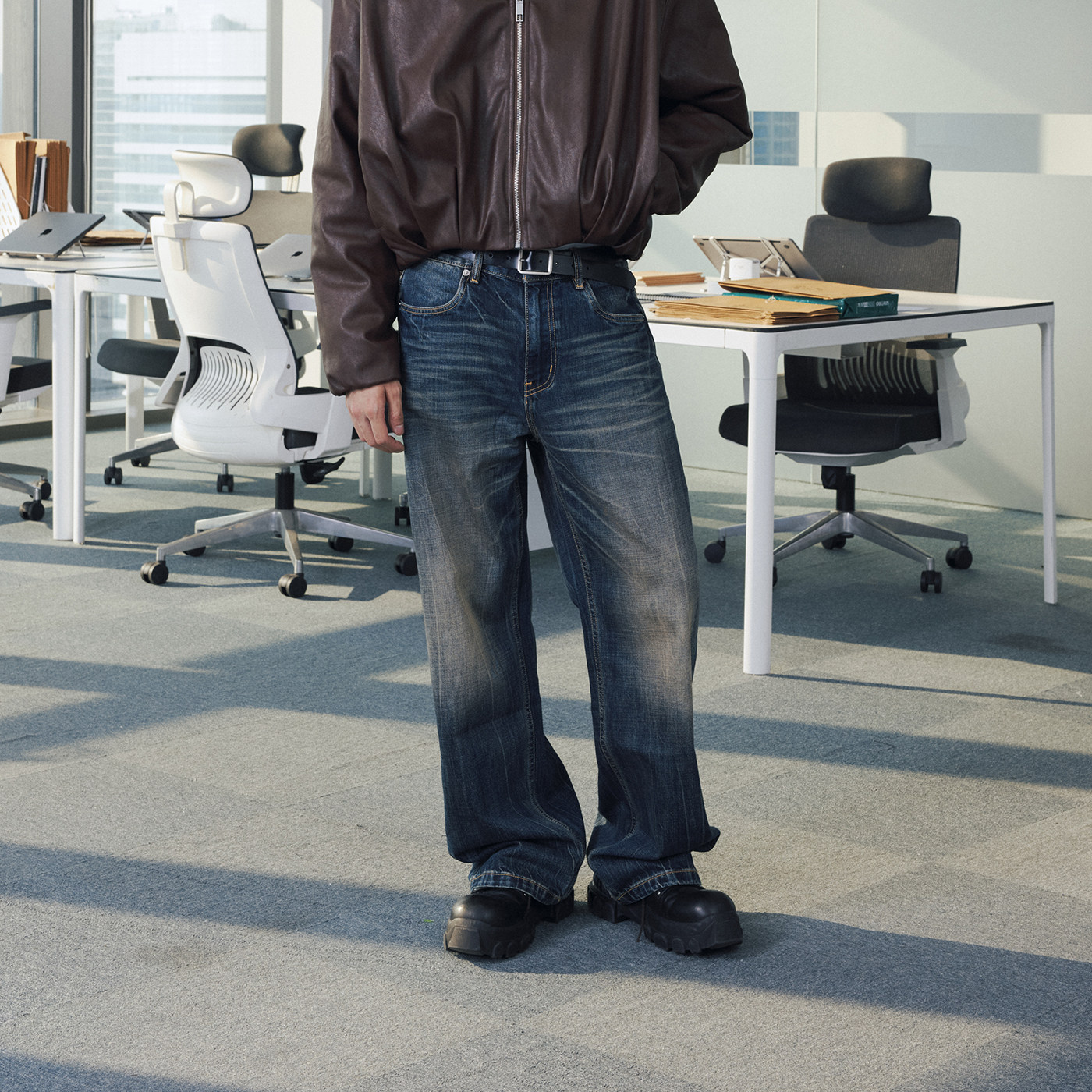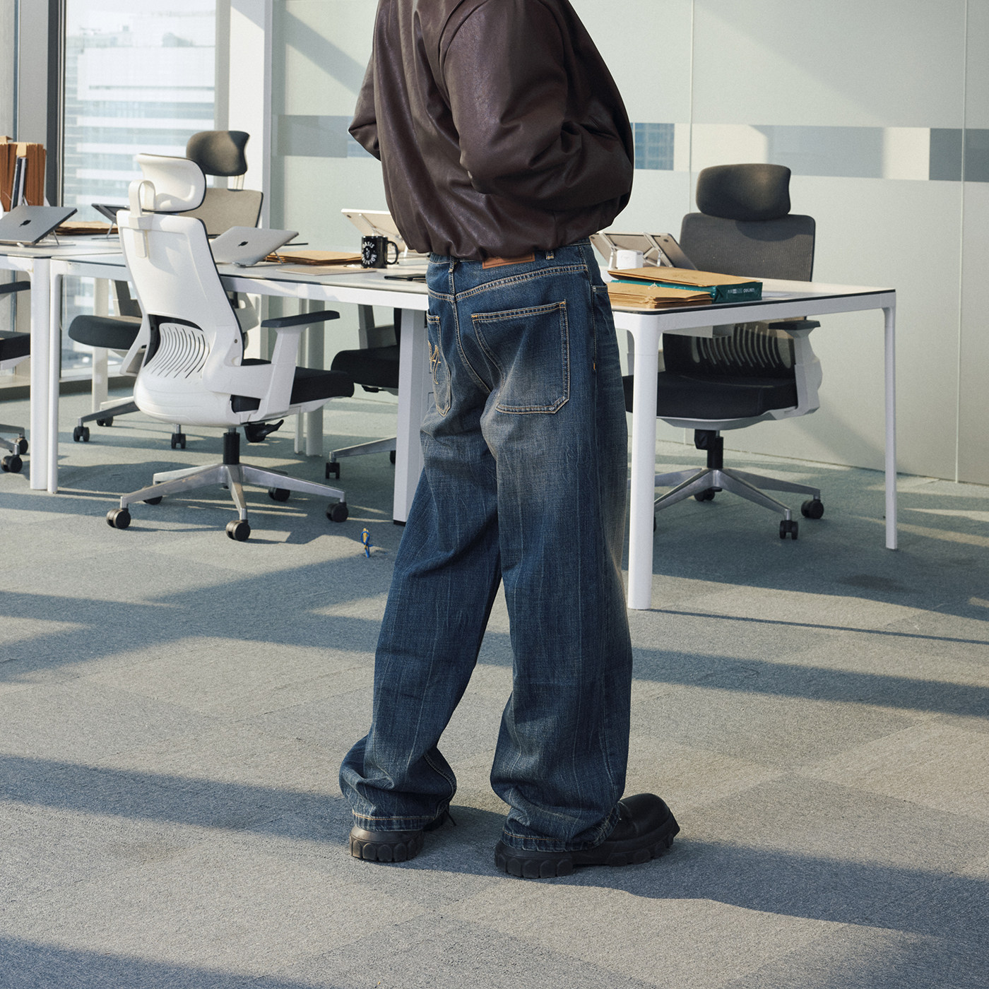 📚 【黄景瑜同款】OaOO深蓝色闪电纹牛仔裤复古水洗宽松直筒微阔长裤