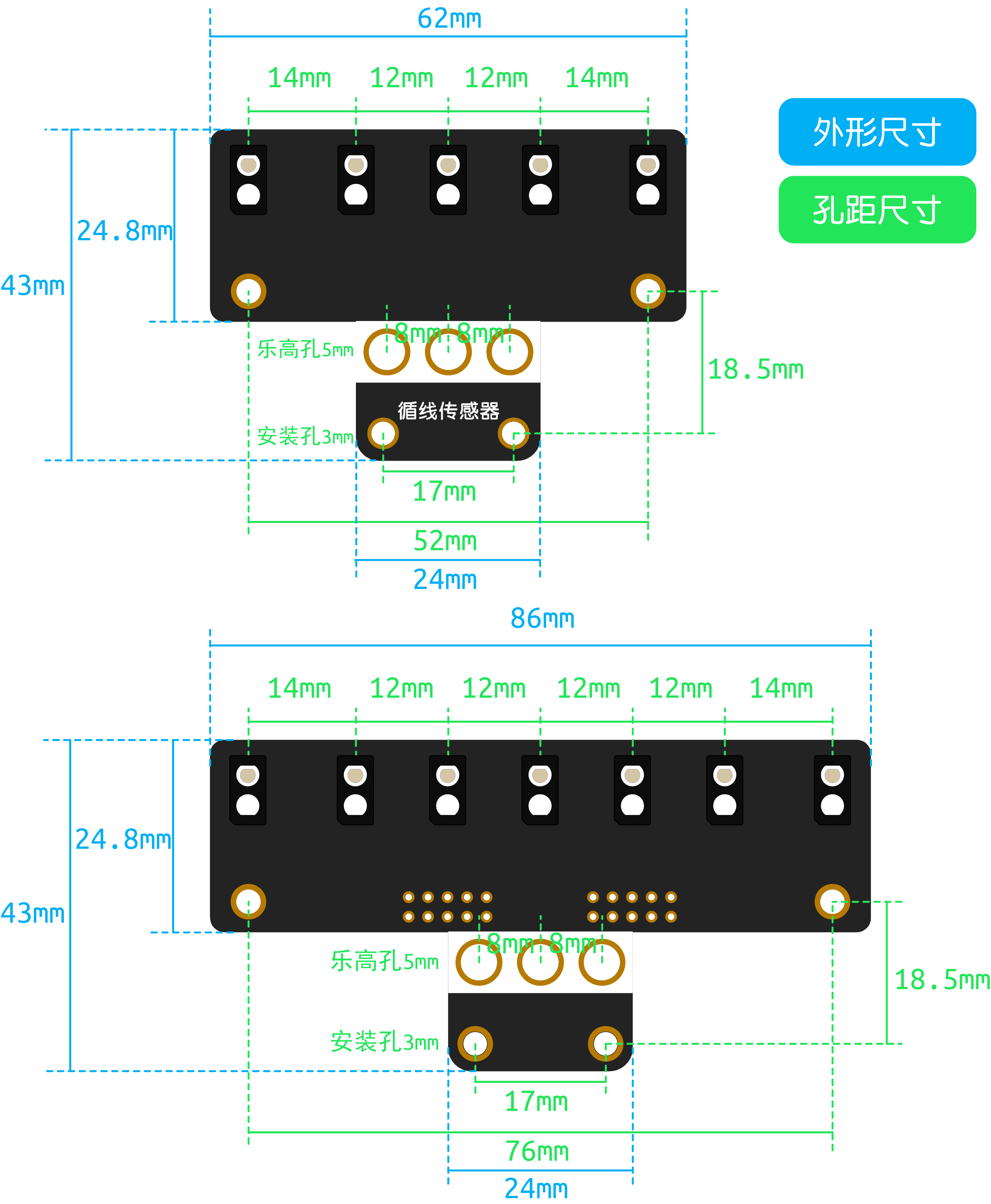 📚 IIC5路巡模块7路寻迹智能小车灰度传感器兼容Arduino掌控板积木孔