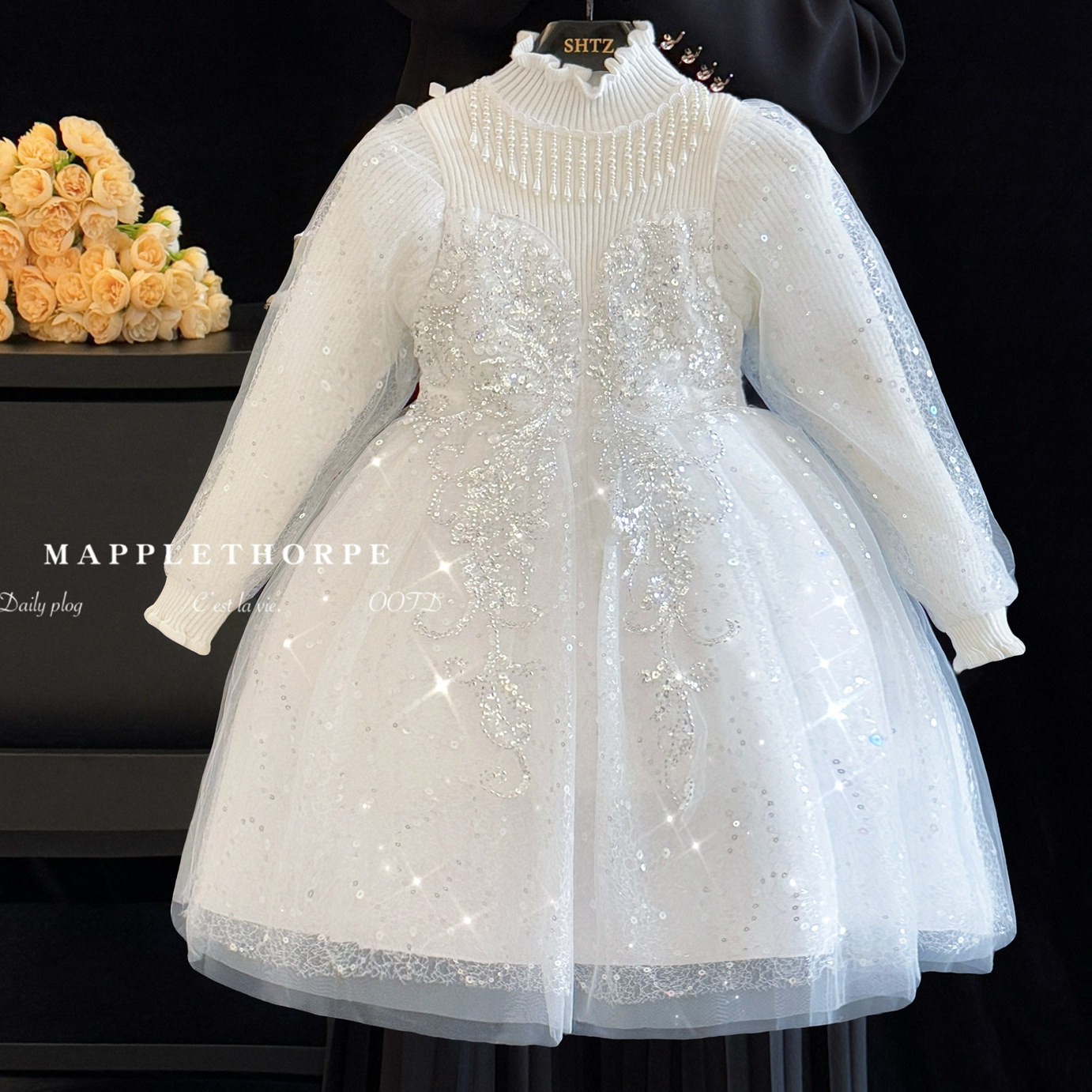 📚 女童连衣裙秋冬款2025新款白色花童礼服儿童高级感亮片精致公主裙